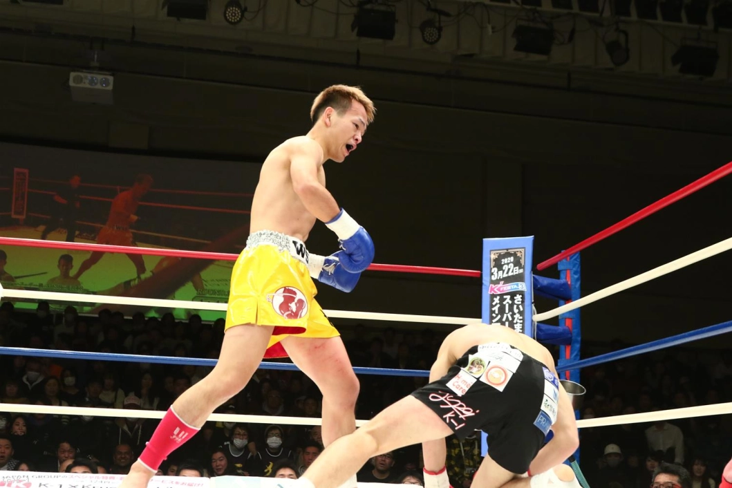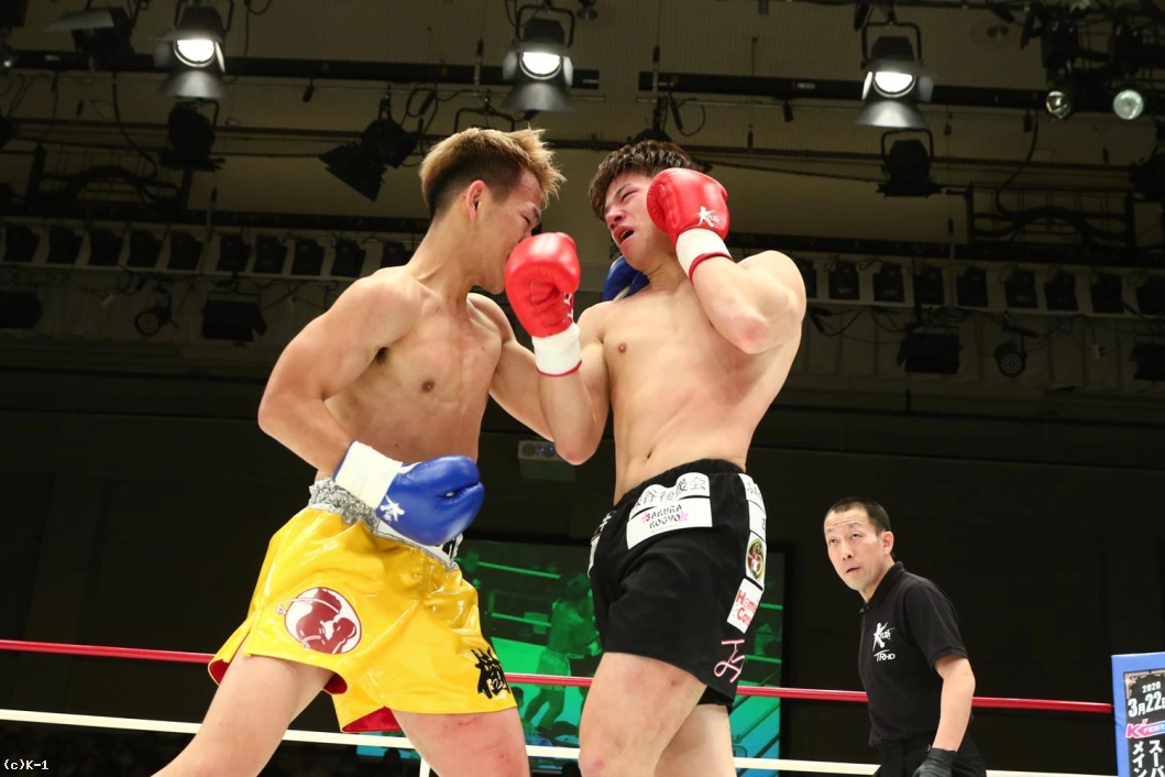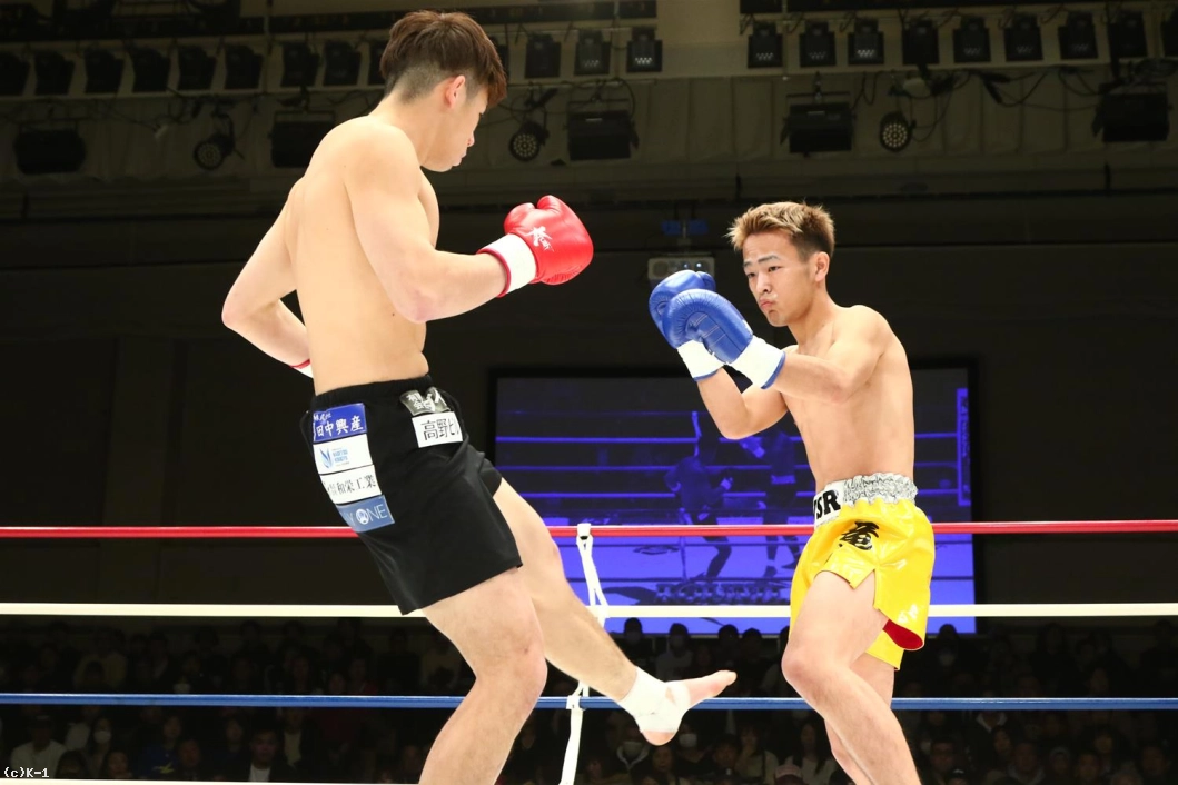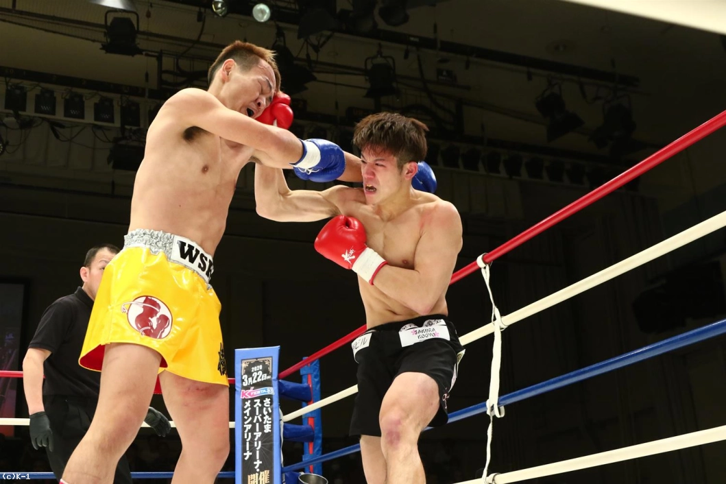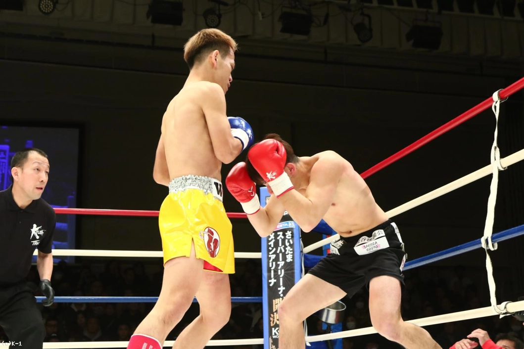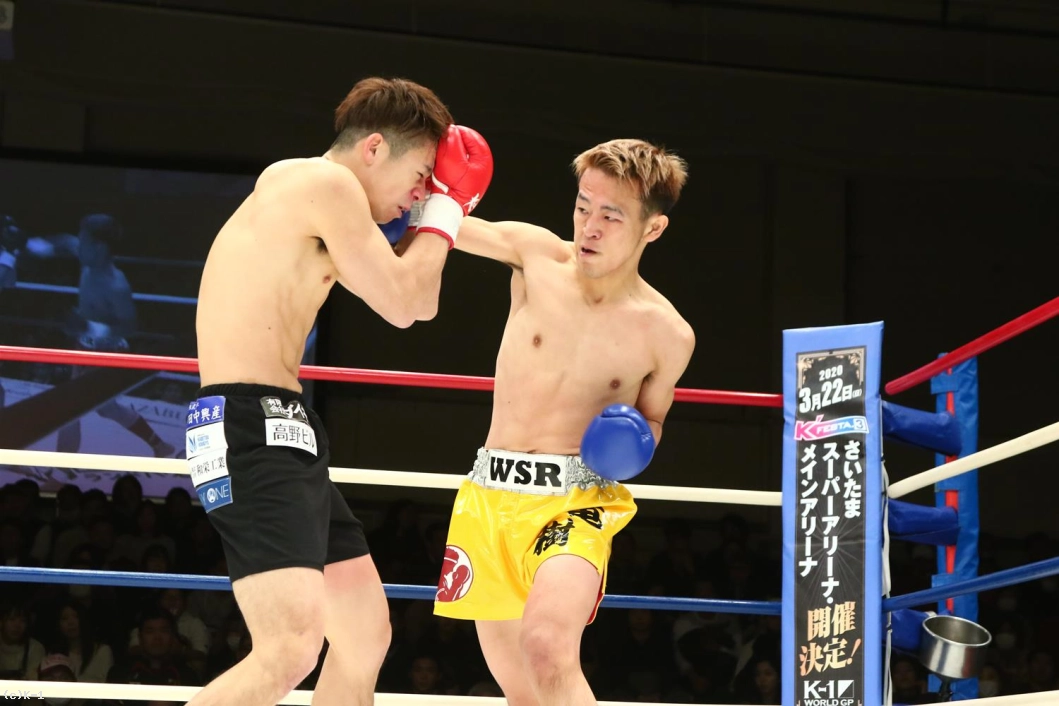 2R、竜樹は右ストレートと左フックに力を込め佐野を攻める。佐野も右クロスを決めて竜樹を下がらせ、そこから両者パンチの打ち合いとなる。佐野はダウンのダメージが抜けてきたかの様子だが、竜樹のジャブと前蹴りに阻まれ間合いを詰められない。