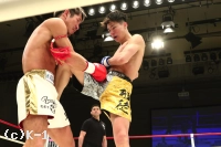 2R、岡嶋はパンチに力を込め、右ストレートで倉崎を後退させる。岡嶋はヒザ蹴りも鋭く、倉崎も前に出ようとするのだが度々後退させられる。そしてコーナーを背にしたところで岡嶋が右ストレートを突き刺しダウンを奪う。岡嶋はなおも右ストレートで攻め立てるが、倉崎もカウンターの左フックで迎え撃つ。岡嶋は口が開き、攻め疲れかやや失速がうかがえる。