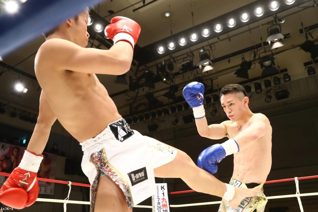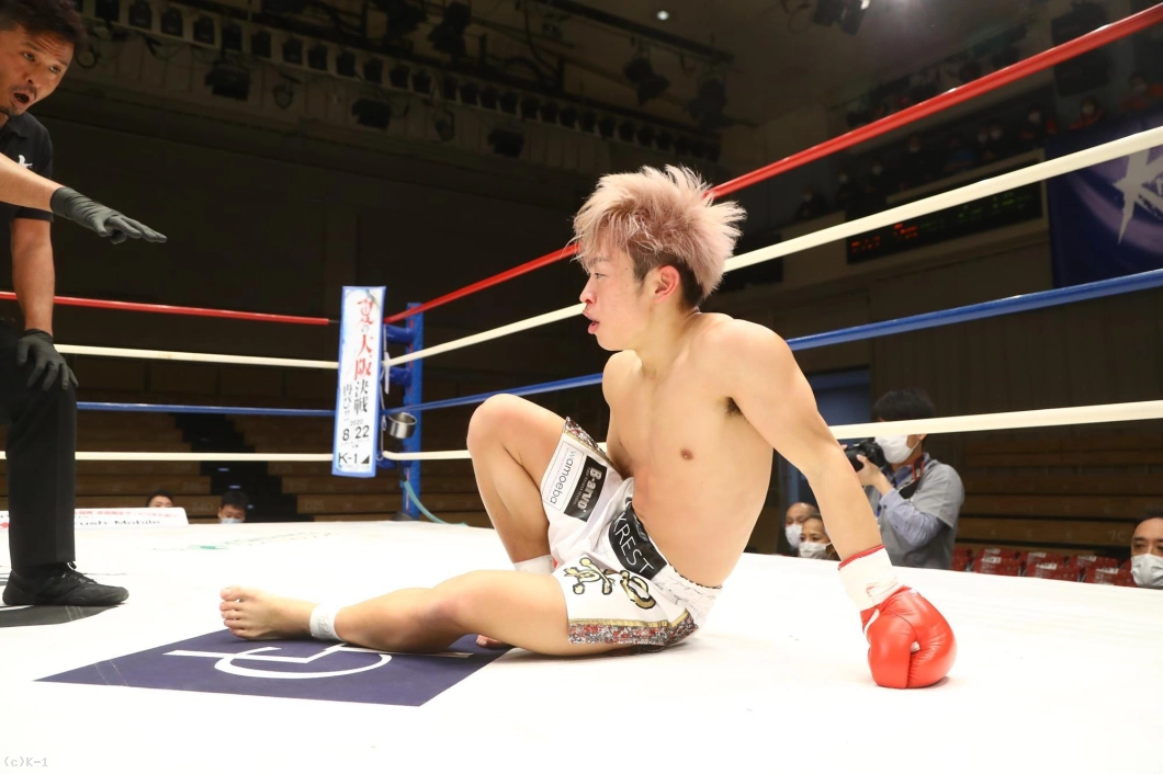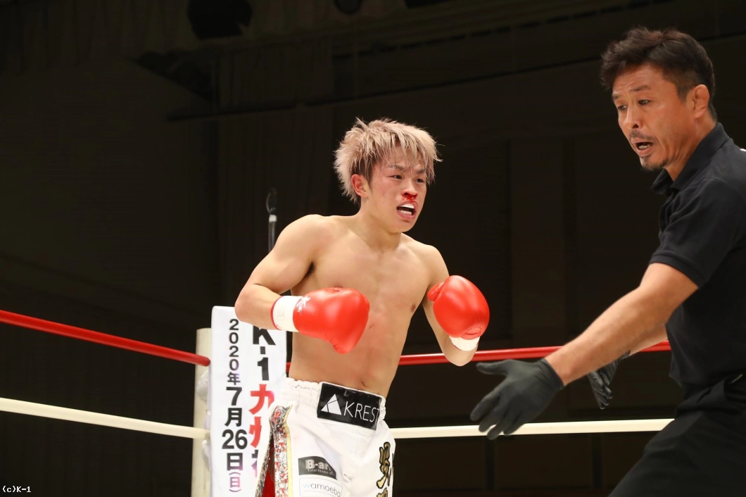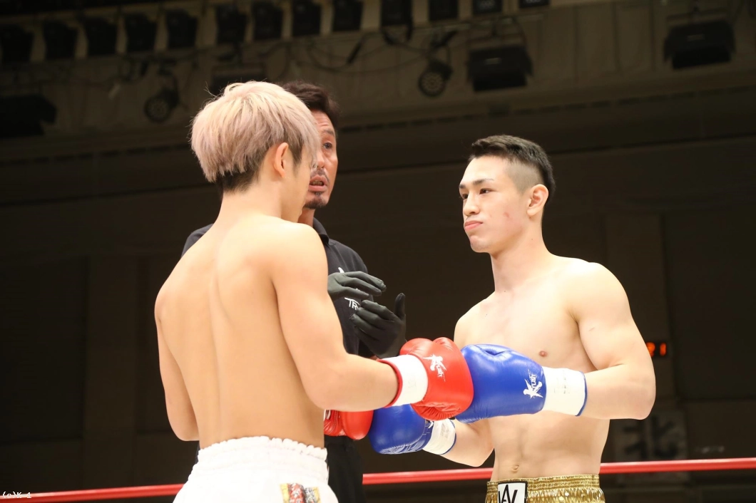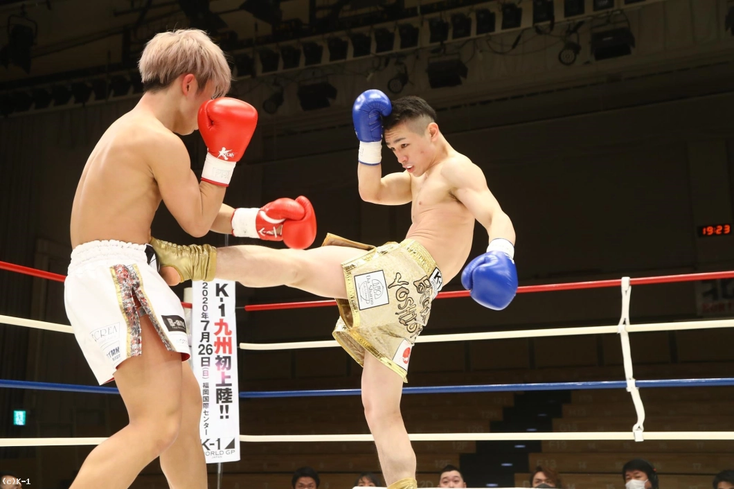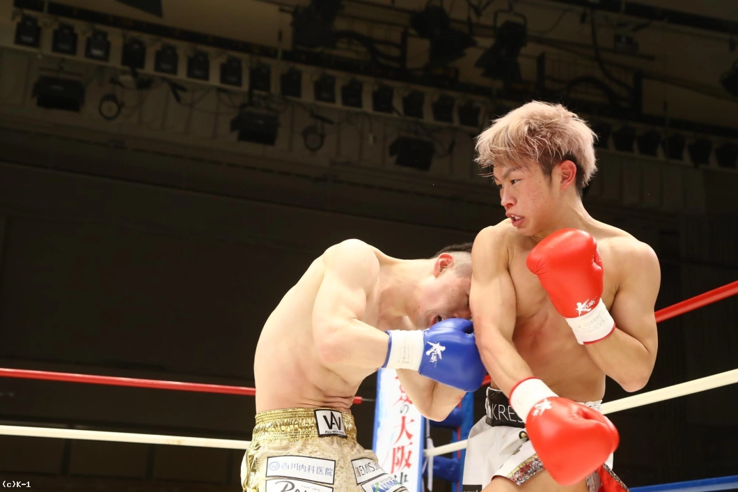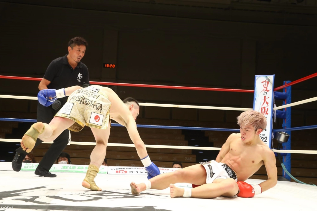 2R、ボディをかばってかやや右手のガードが下がっている晃貴だが、右ローを連続で吉岡に蹴り込む。しかし吉岡が左ボディからの右ストレートを当て、この試合3度目のダウンを奪取する。それでも立ち上がった晃貴は右ローを当てて反撃。吉岡も右ローを返す。晃貴は右ローに力を込め、脚へのヒザ蹴りも見せる。吉岡は左脚を紫色に腫らしながらも、バックブローも見せて応戦する。