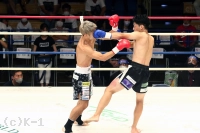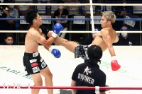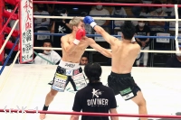 1R、佐々木は右ローを飛ばして当て、近藤の接近をけん制する。さらに右ストレートも伸ばし、積極的な仕掛けでペースと距離感を掴みにいく。そして右ストレートから繋いだ左ミドルでボディをとらえ、これに近藤はダウンを喫する。サウスポーに構えた佐々木は左ミドルを入れ、続いて左ストレート伸ばす。