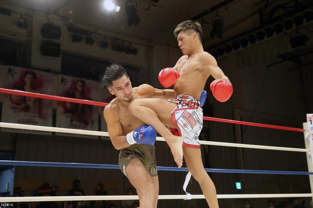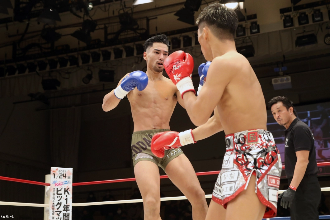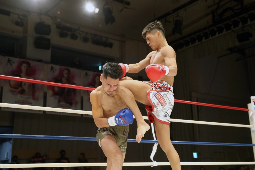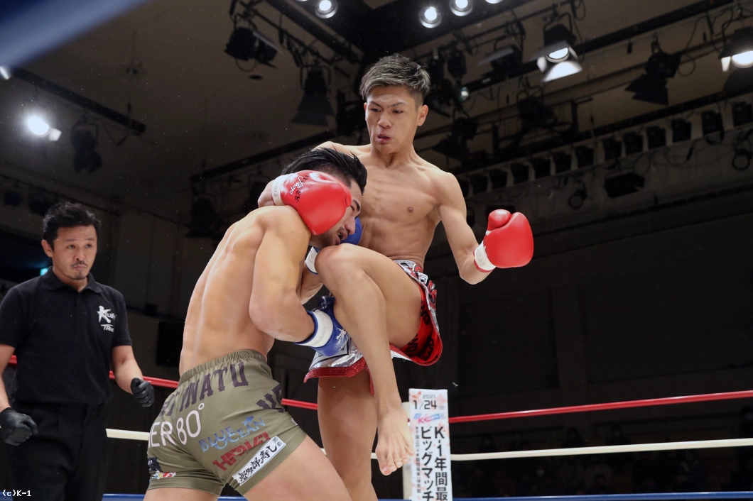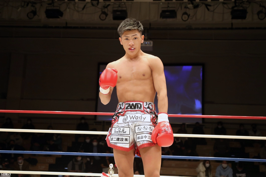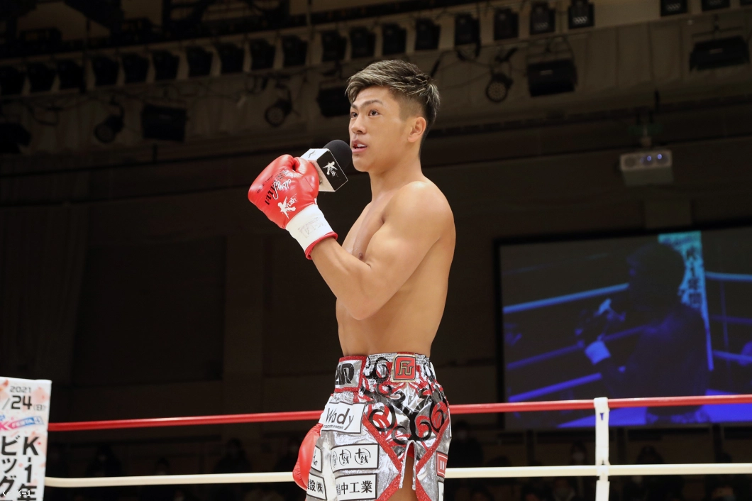 「勝てたんでよかったんですけど、練習した動きが出せなかったんで、まだまだ頑張っていきます。(相手の印象は?)映像よりパンチが重くて、そこで力んじゃいました。でも途中でヒザ蹴りを合わせられると思って、ヒザで倒せてよかったです。(今後の目標は?)チャンピオンの新美貴士選手とやりたいと思っているので、次はタイトルマッチがいいです」