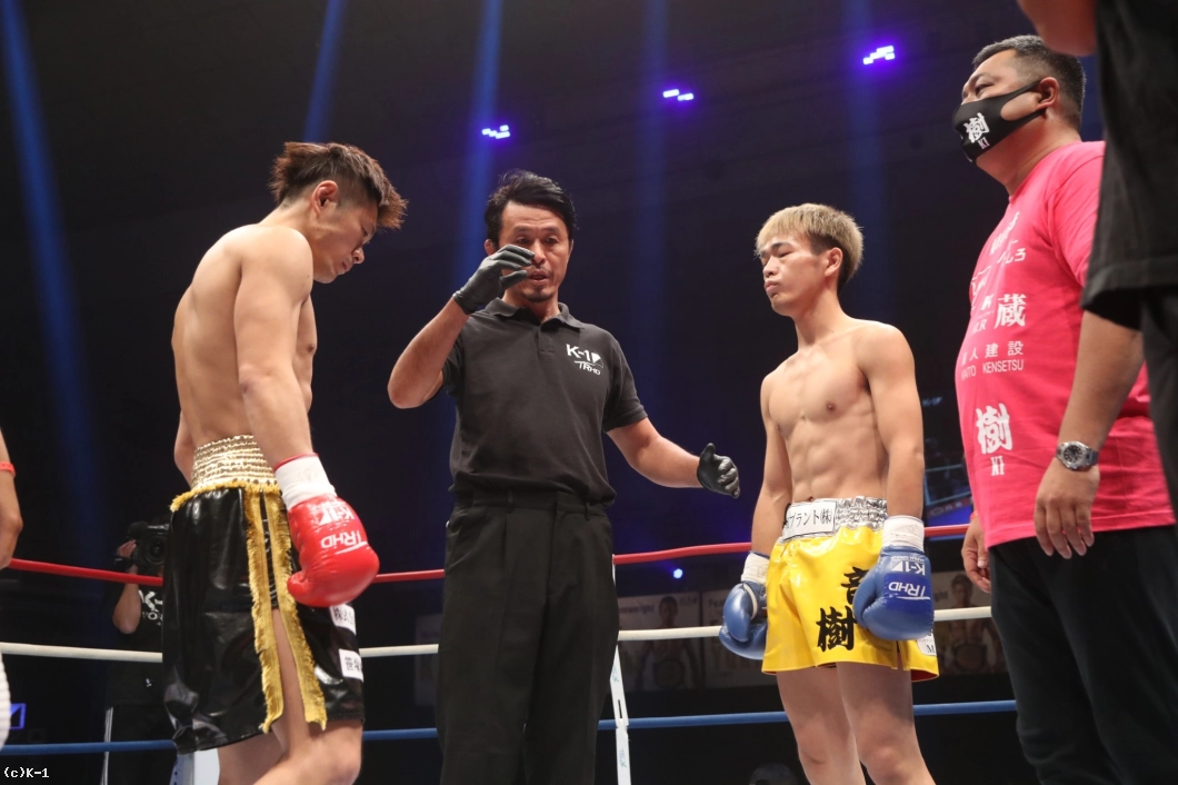 3Rも竜樹が前に出て水町にロープを背負わせる。水町の後ろ回し蹴りを前蹴りで崩す竜樹。両者近距離で左右のフックを回転させるが、どちらもガードがしっかりしておりクリーンヒットとはならない。ラウンドが進むにつれ、水町が頭を振りながら放つ左右のフックで竜樹を後退させていく。判定は30-29(水町)、29-29、29-29でドロー。延長戦に突入となる。