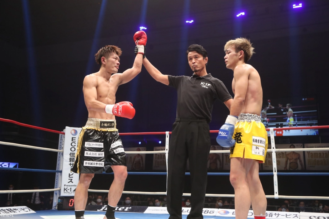 延長R、両者左右のフックを打ち合うが、先にとらえたのは水町。さらにボディへのヒザ、後ろ回し蹴りと攻撃を散らす。ラウンド中盤から距離ができると水町は前蹴り&ジャブ。そして竜樹が入ってくるところにフックを合わせる。この振り回す左右フックが竜樹をとらえる。判定は3者10-9で水町。40歳と20歳の年齢差対決を制した。