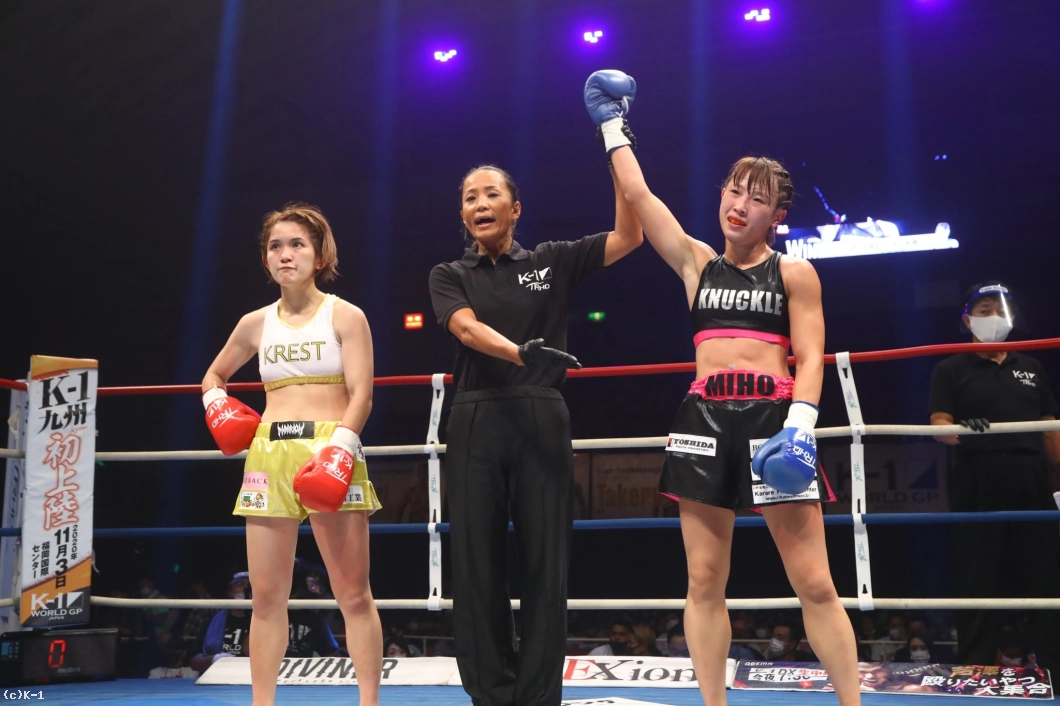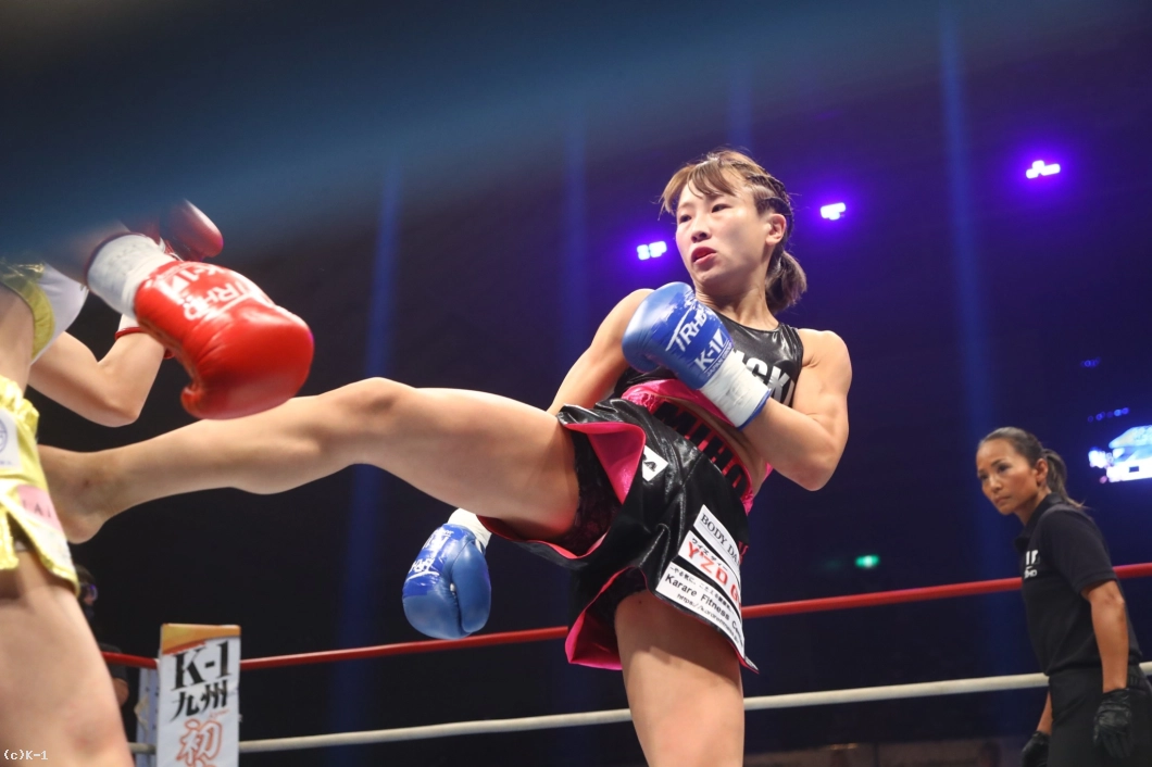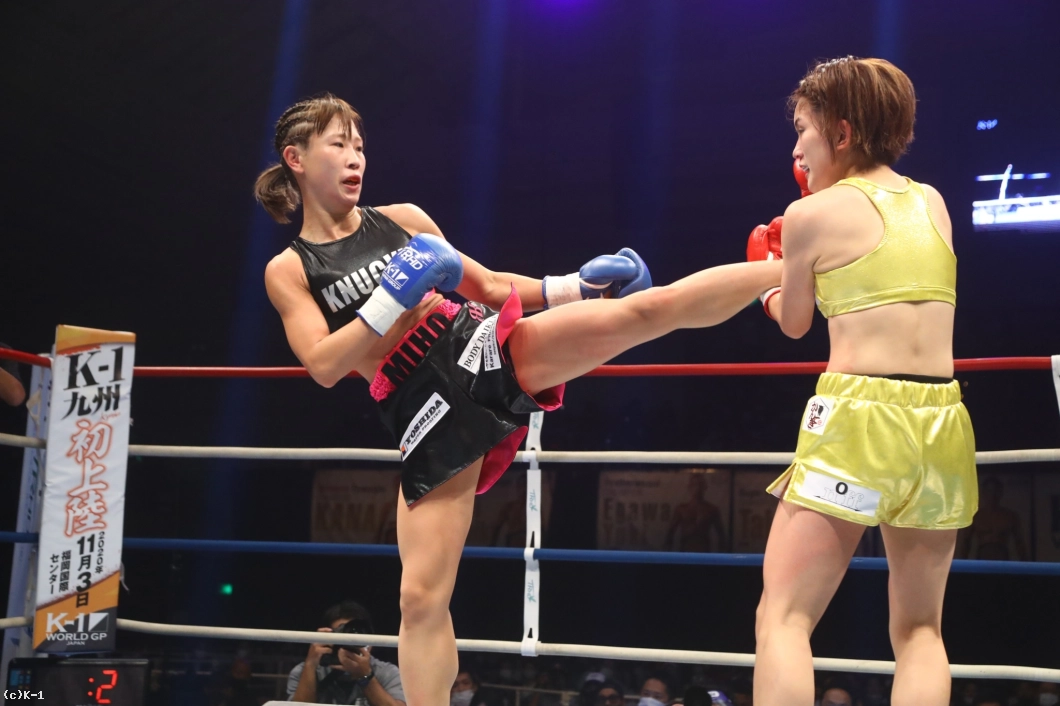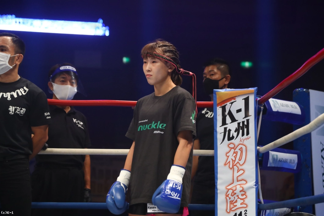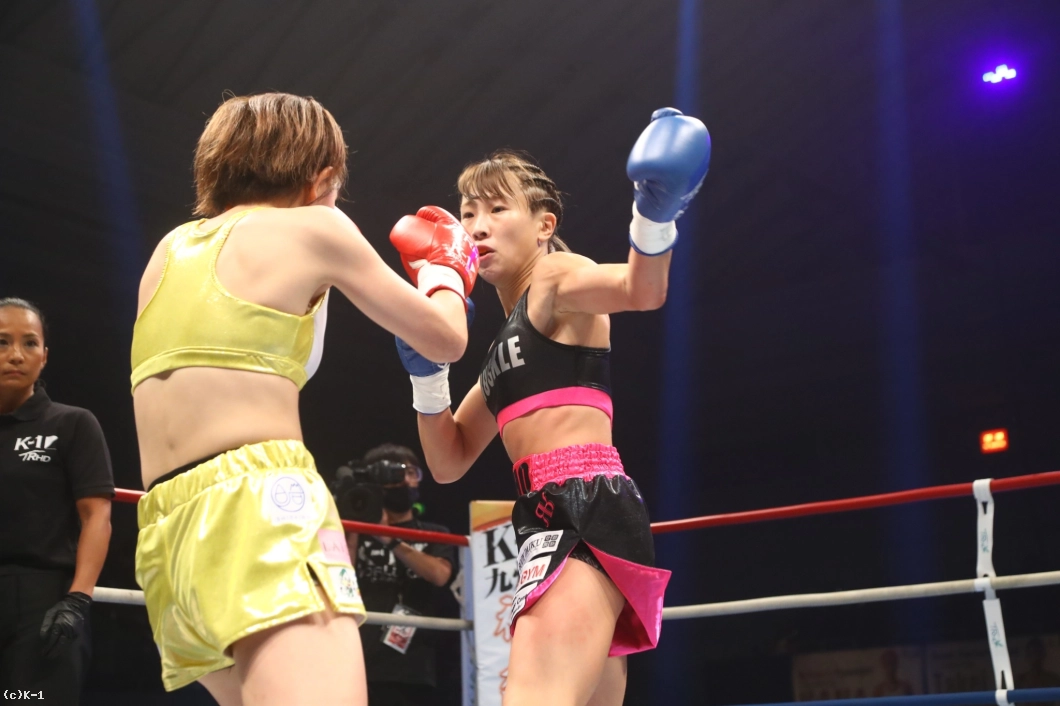 「(試合の感想は)勝ててホッとはしてるんですけど、詰めが甘くて『倒す』っていうのができなくて、反省してます。(相手の印象は)自分より身長が低い相手は今までやった中で初めてだったので、やりやすかったと言えばやりやすかったです。(相手の技術とか経験で感じた部分は?)自分が思ってたより、そんなに『強いな』っていうのは、あんまり感じられなかったです。でも三日月蹴りを狙われてたりして、女子で三日月蹴ってくる選手って今まであんまりいなかったので、そこ…ぐらいですかね。(勝ったことで、新設のミニマム級で一歩抜け出たわけですが)ぶっちゃけ、日本人の48kgって、他に強い選手いるのかなって思うので、コロナが落ち着いてトーナメントができるようになったら、外国人と戦ってトーナメントをやりたいです。(今後は)今日は本当に応援ありがとうございました。ちょっとしょっぱい試合しちゃったんですけど、次こそは絶対倒して、ミニマム級で倒せる女子は私っていう風に思わせる試合をするんで、これからも応援よろしくお願いします」