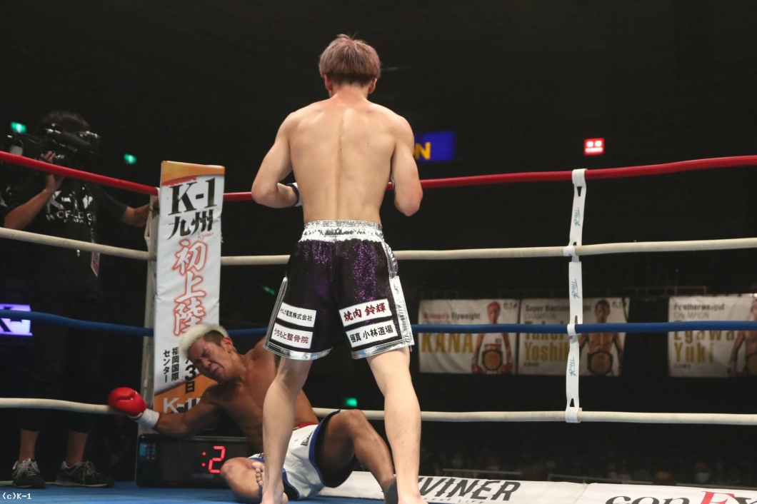 永井は勢いを増し、ロープを背負った梨緒弥に打ち下ろしの右ストレートでダウンを追加しラウンドを終える。