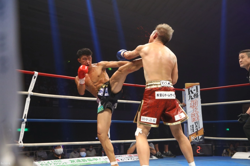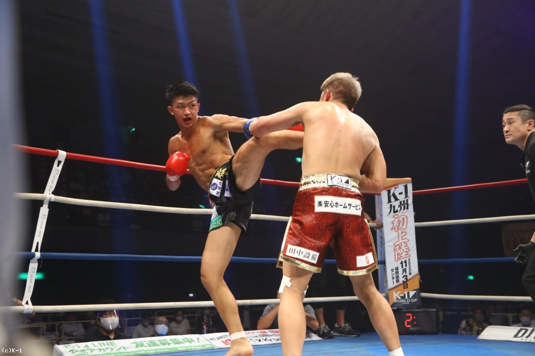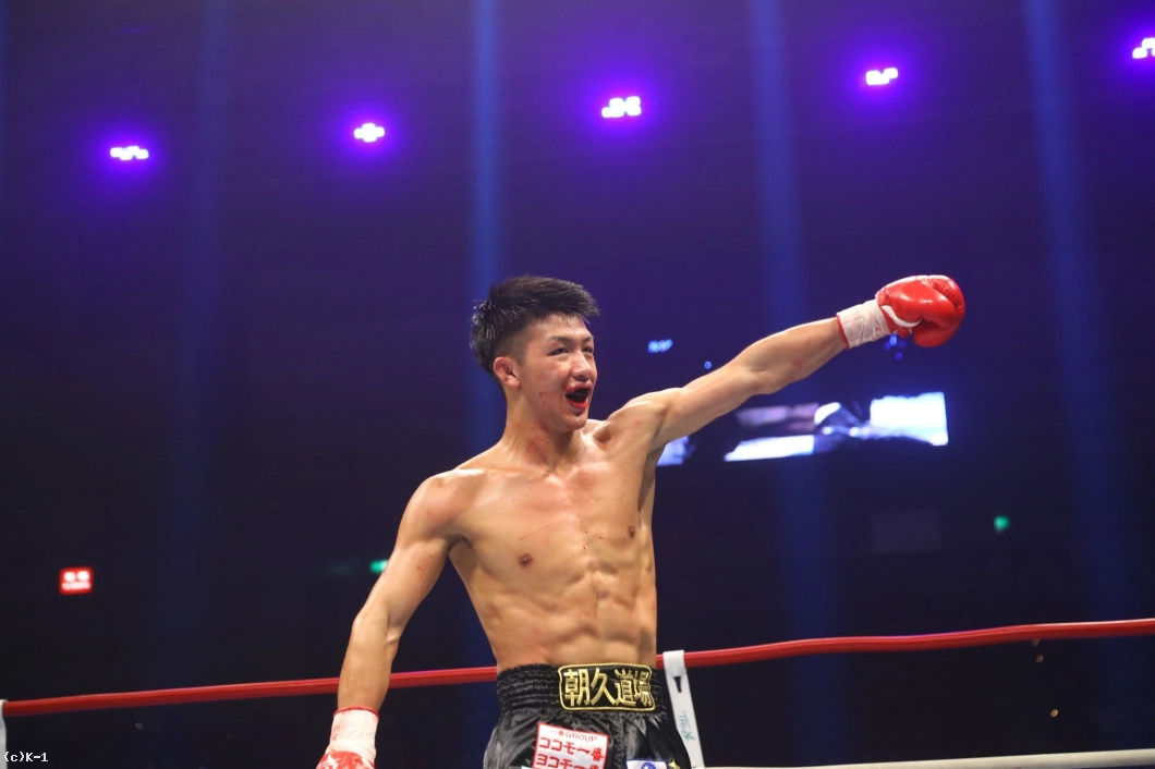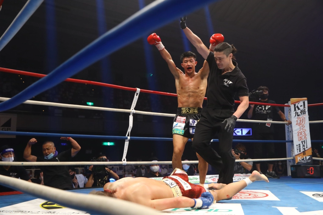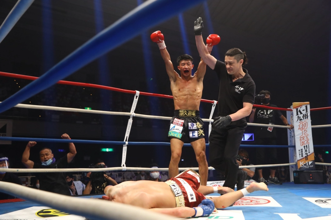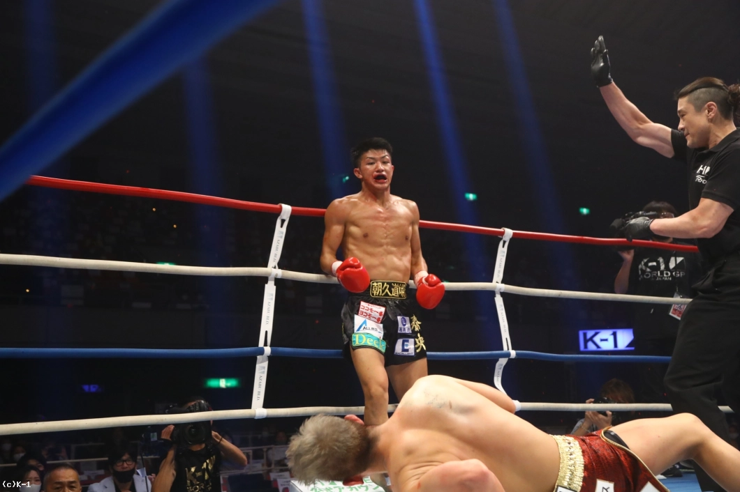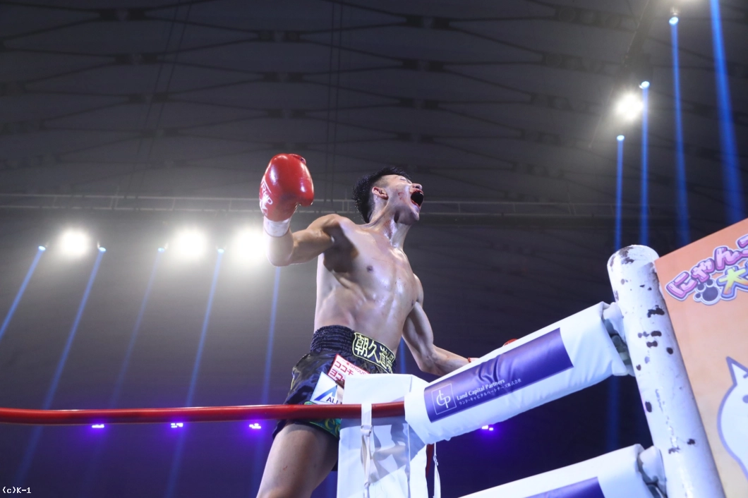 (最後のハイキックは狙ってた?)そうですね。僕は毎日8時間以上、練習してるので、どんな状況でも倒せる一撃を出そうと思って。最終的には俺が勝つんだという気持ちを持って戦って。狙ったというよりは、朝久流が染み付いてたというか。記憶が曖昧な部分はあるんですけど。