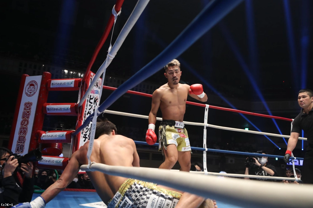 1R、村越は自ら下がって距離をあけ、前蹴り・横蹴りを飛ばす。山本はこれに阻まれながらも右ボディストレートを決め、顔へのパンチを振るっていくが村越は当てさせない。左ミドル、左ストレートで遠ざけんとする村越。山本が踏み込んだところへ村越は左フックを当てダウンを奪う。