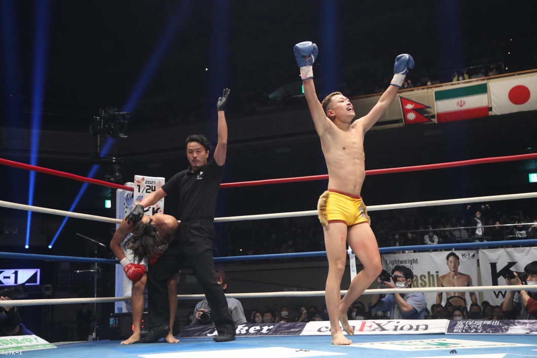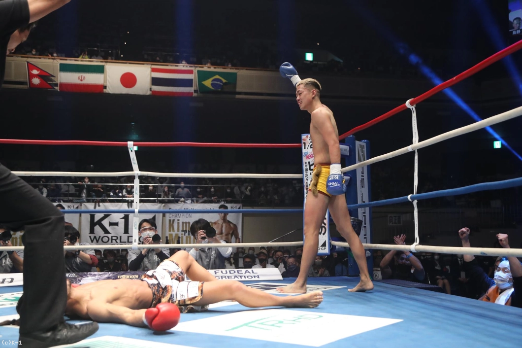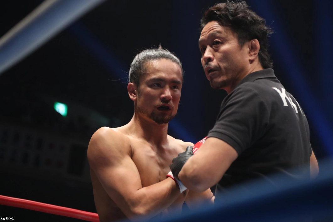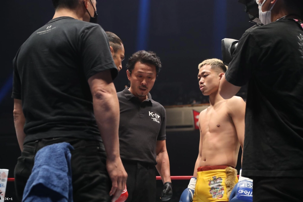 「みなさん、ありがとうございます。ほんと来てくれてる人や応援してくれる人にずーっと恩返しできなくて、やっと恩返しできました。こんなもんじゃないんで、まだまだ強くなれるんで、もっともっと俺はできるんで。このあと紀左衛門くんと木村ミノルくんが出るんで応援お願いします。今日のK-1は芦澤竜誠でした」