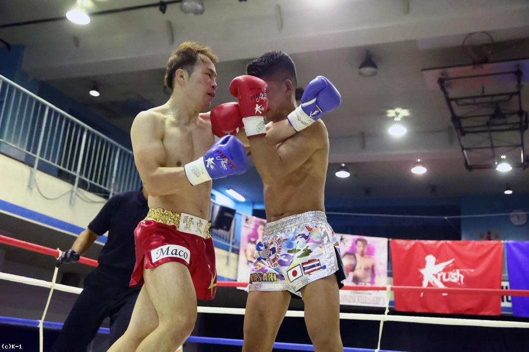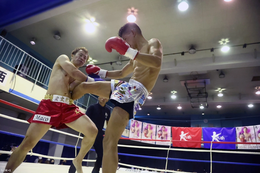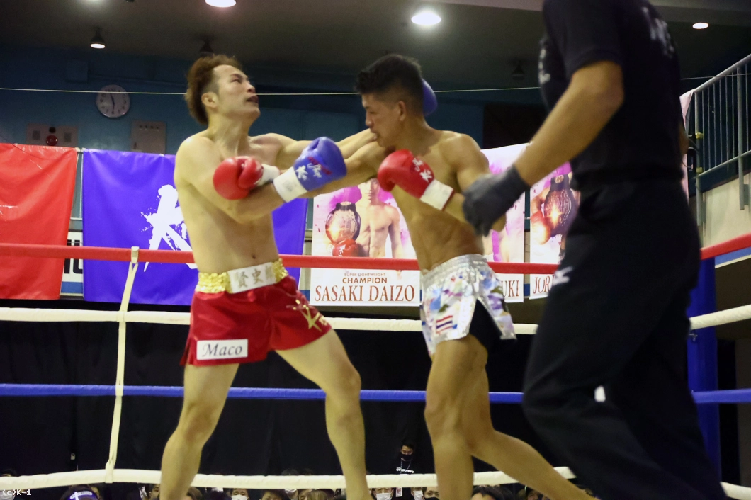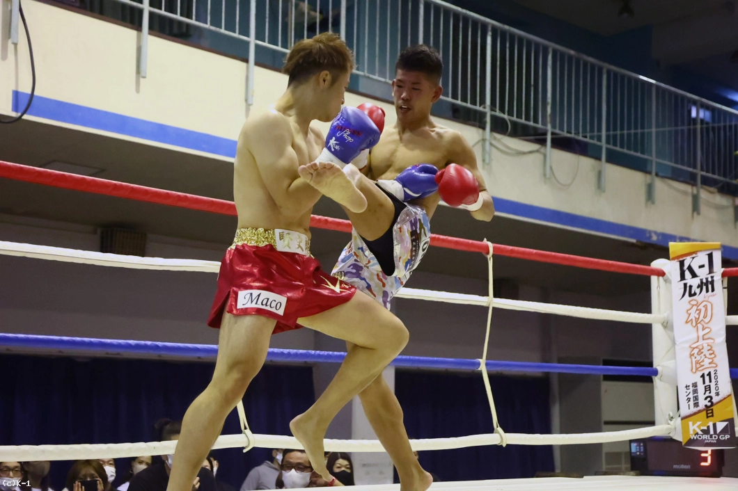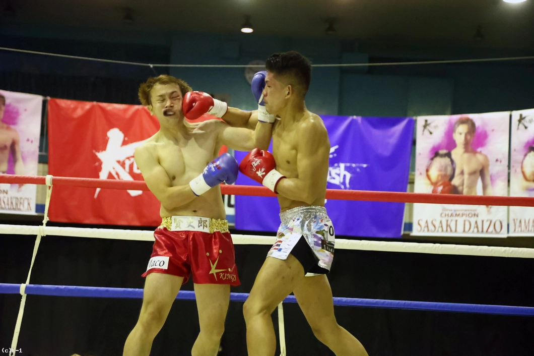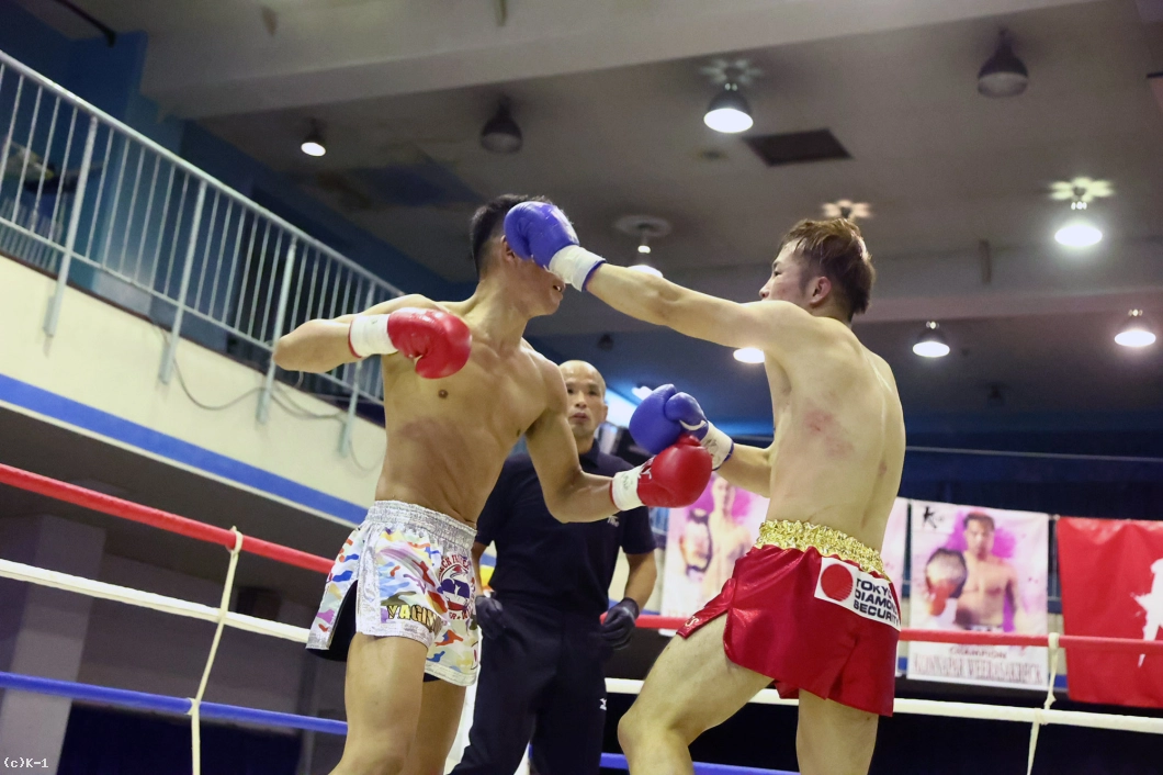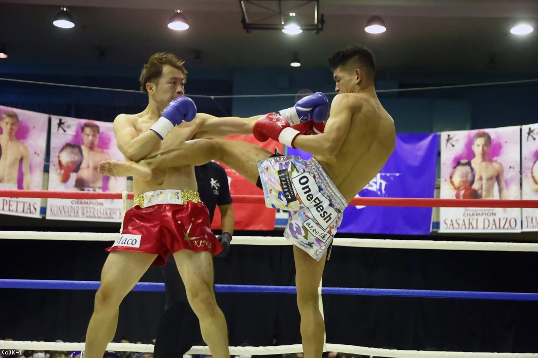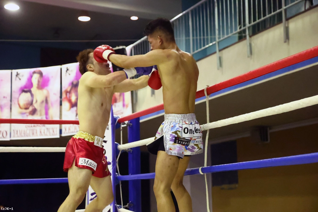 1R、髙口が距離を詰めてパンチを打ち込む。八木はヒザ蹴りで迎え撃ち、左ボディからの右ストレートを効かせる。2Rも距離を詰める髙口、ヒザ蹴りとパンチで迎え撃つ八木という展開が続き、3Rに八木のパンチで髙口の足が止める。細かく攻撃を効かせた八木が判定勝利した。