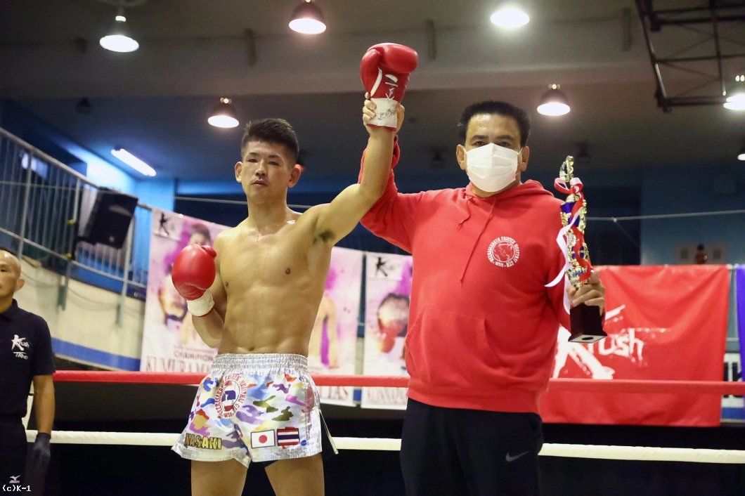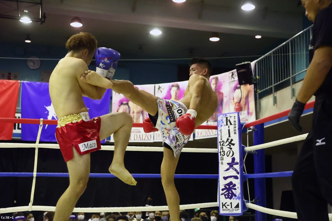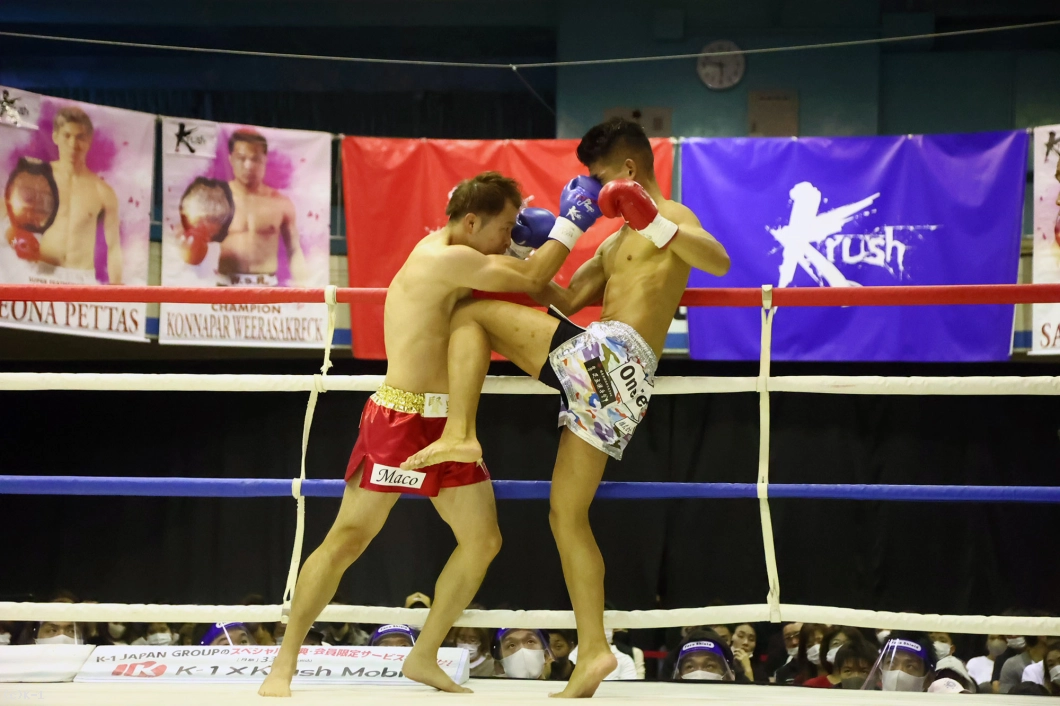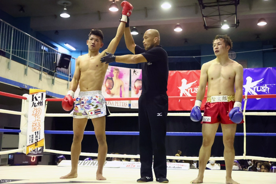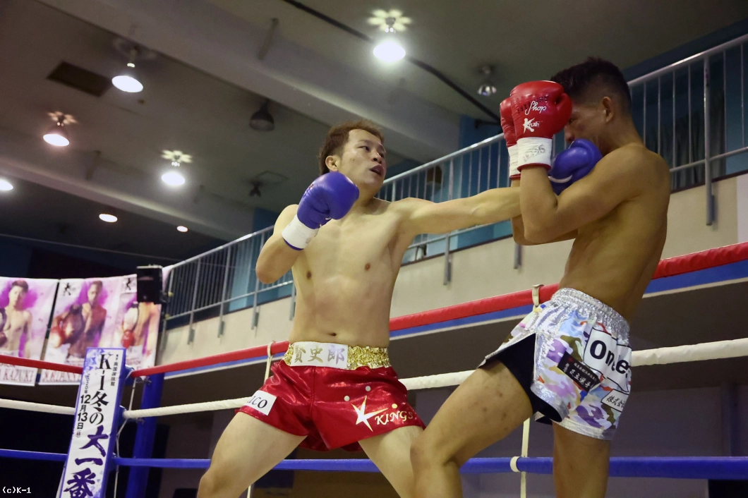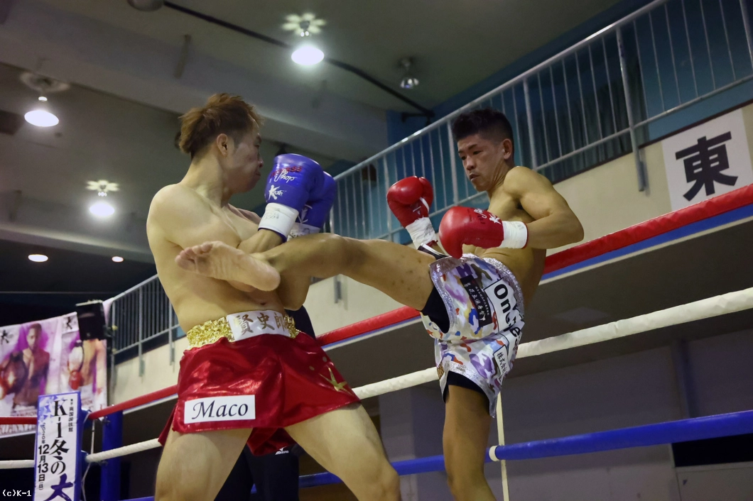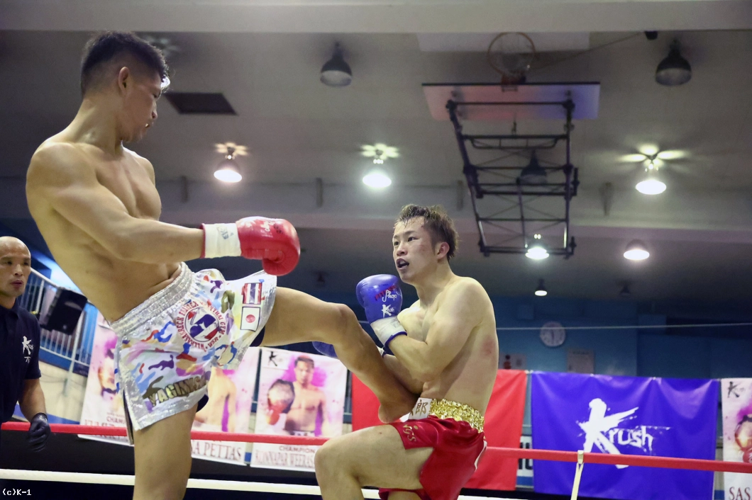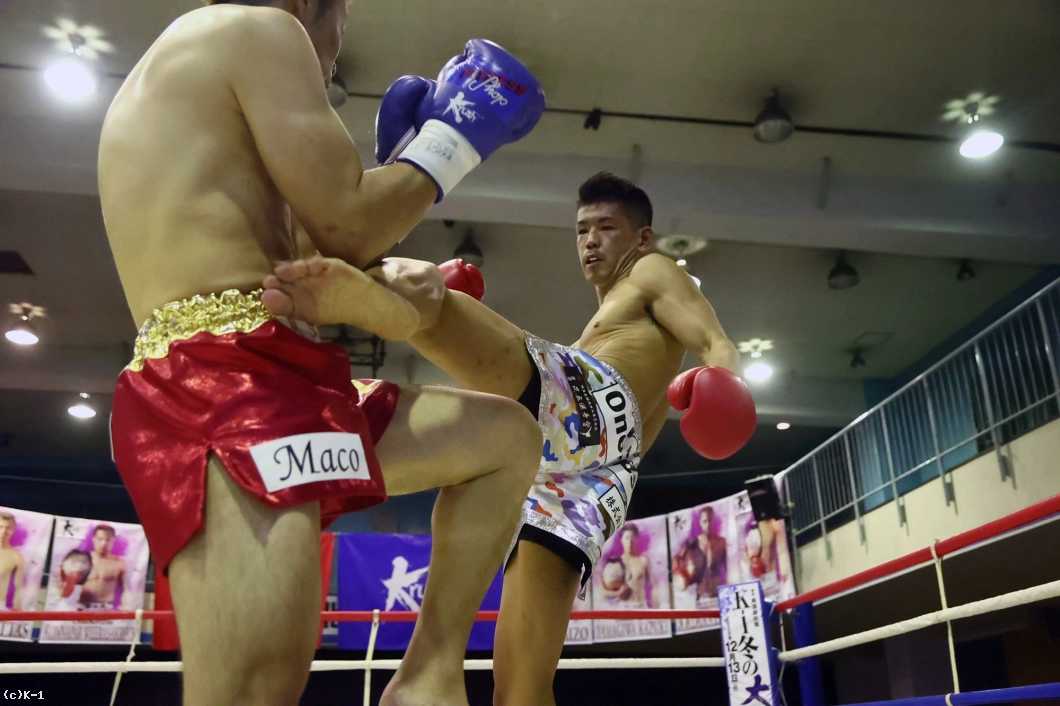 1R、髙口が距離を詰めてパンチを打ち込む。八木はヒザ蹴りで迎え撃ち、左ボディからの右ストレートを効かせる。2Rも距離を詰める髙口、ヒザ蹴りとパンチで迎え撃つ八木という展開が続き、3Rに八木のパンチで髙口の足が止める。細かく攻撃を効かせた八木が判定勝利した。