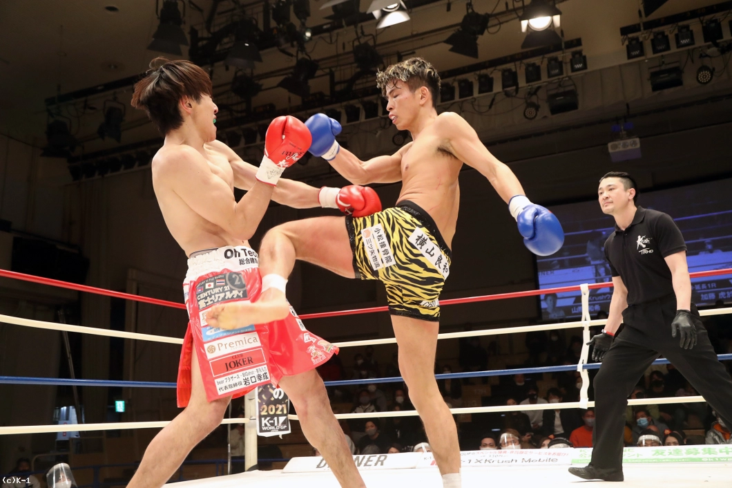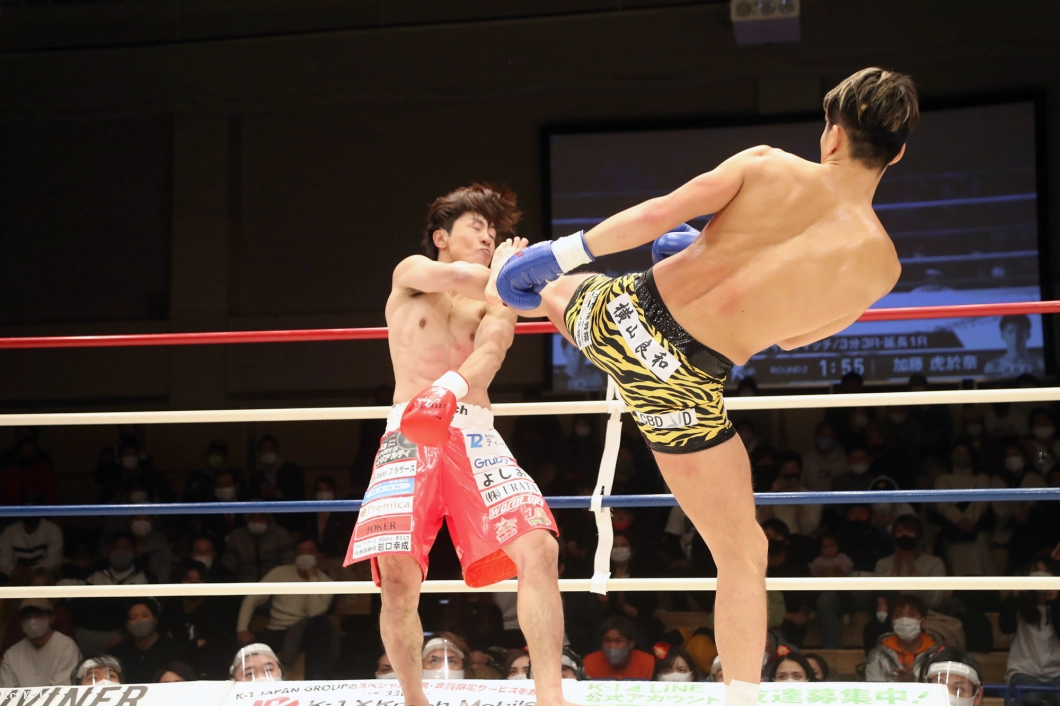 3R、加藤はこのラウンドもカーフキックを決める。山際は足にダメージがうかがえるがパンチを振るっていく。しかし加藤にヘッドスリップされて当てられない。両者組みが多くなりレフェリーが注意する。加藤はジャンプしての二段蹴りから打ち下ろしの右ストレート、連打を決めてダウンを奪う。立ち上がった山際だが反撃に振るったパンチはとらえられずゴングとなる。判定は30-26、30-26、30-27の3-0で加藤。兄レオナともにKrush史上初となる兄弟同時王者となった。
