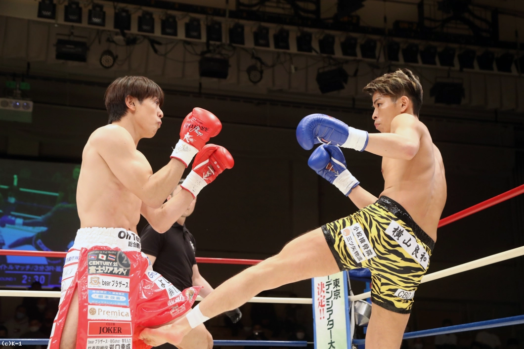 2R、加藤はローで意識を下げさせ、右ストレートを2度クリーンヒット。山際は後退するもロープに救われる。山際も蹴り返すが、加藤が圧力を掛けていく。加藤はカーフキック(膝から下へのローキック)を効果的にヒットさせる。