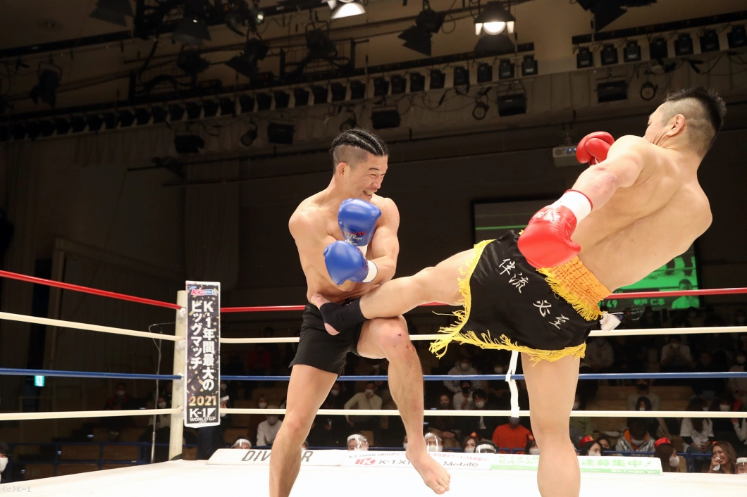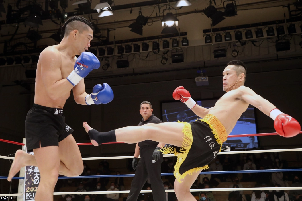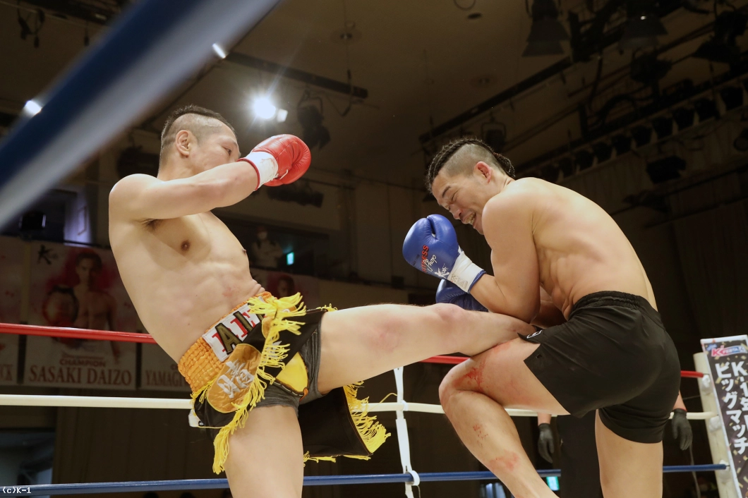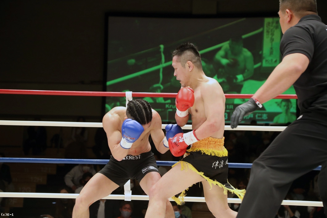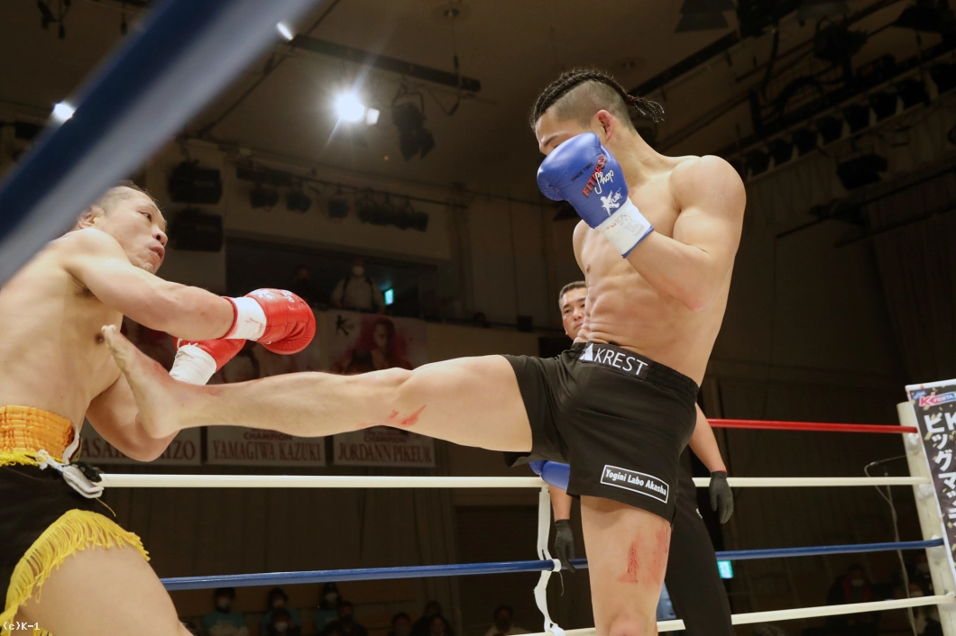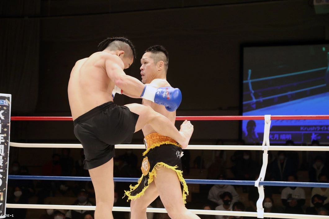 2R、大月はサウスポーとなり前蹴りで明戸を押さえ、オーソドックスに変わると右ローを入れる。明戸は臆さずに前に出ると右ストレートをヒット。そして体圧を発して大月をコーナーに追い詰める。右スネから出血が見られる大月。明戸は前進してのプレッシャーで大月の体力を削る。