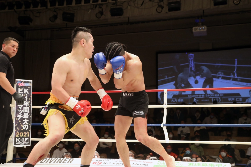 1R、大月は腕を胸と腰あたりの高さにした独特構えから明戸を見据える。明戸はこれにロー、ミドルを放って当てる。大月もローを当て、構えを左右に変えて隙をうかがう。明戸が左フックをヒットさせると、大月はロー・ボディを当て、明戸が飛び込んできたところに右ストレートを当てダウンを奪取する。