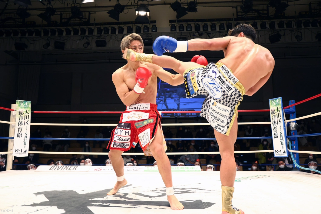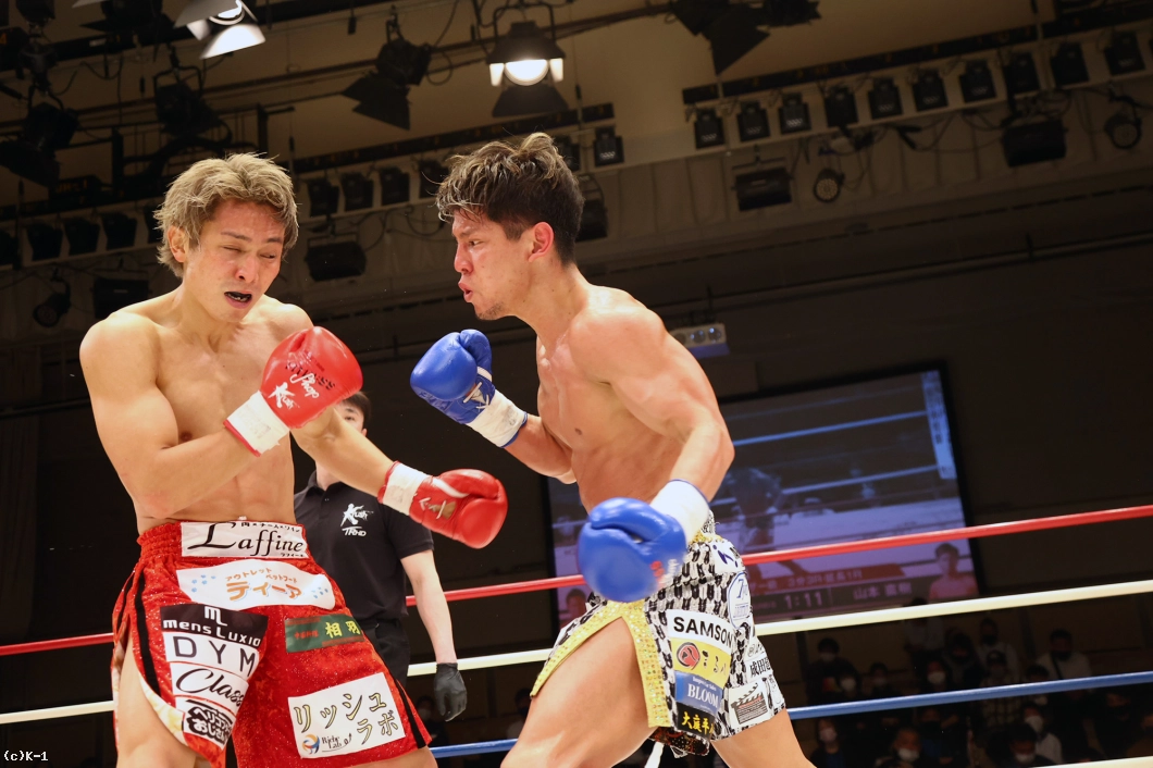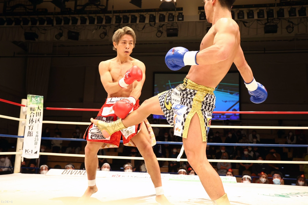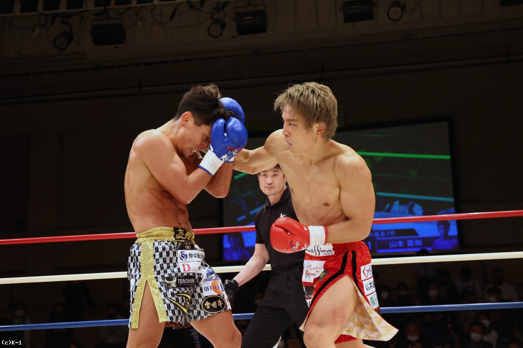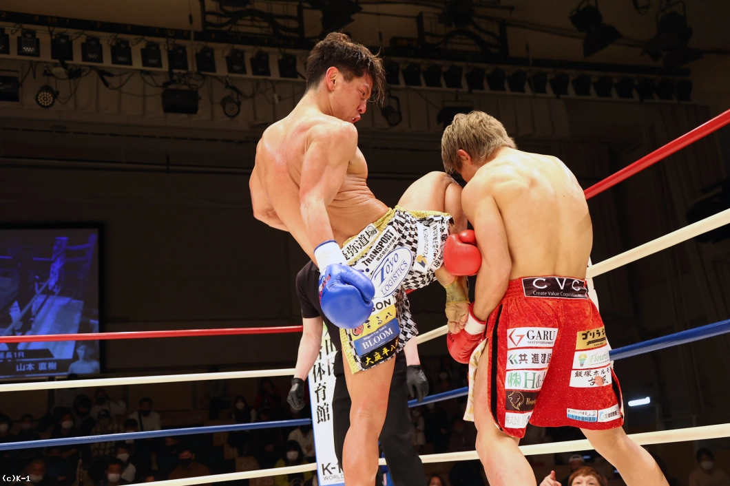 2R、山本は大岩のプレスを押し返してカーフキック、ヴァレリーキックと足を狙い撃ち。さらに足払いで大岩を転倒させる。大岩はジャブ・アッパー・右ストレートと繰り出すが、山本はこれをブロックして左ミドル、右ロー、右アッパーと攻撃を散らす。山本優勢に思われたが、大岩は右フックのヒットから右ストレートを決めダウンを奪う。右ストレート、右フックと大岩がさらに強振して迫るが、ここは山本が耐え抜き2Rを終える。