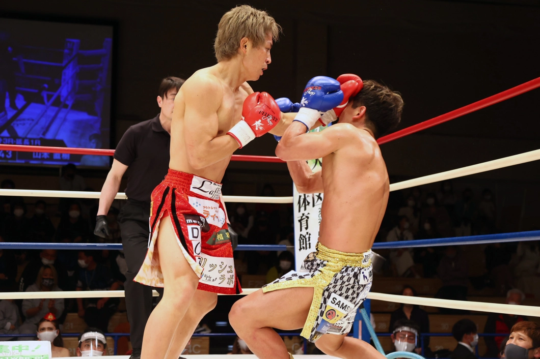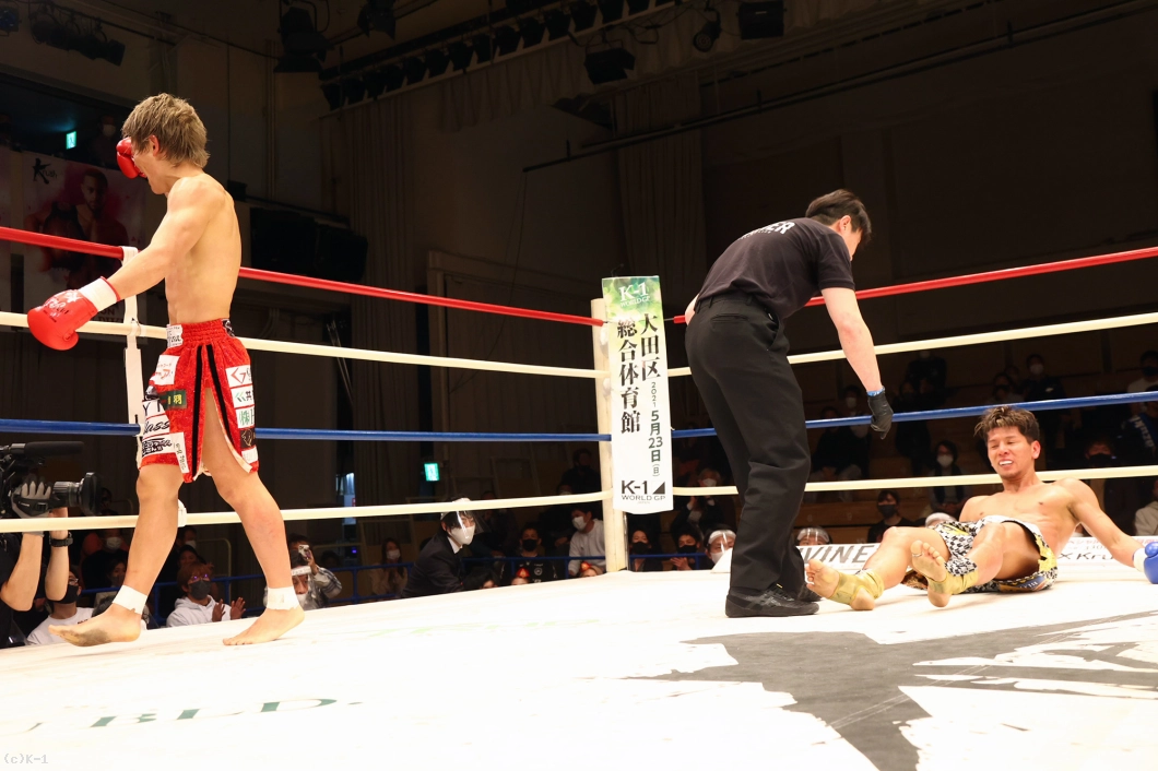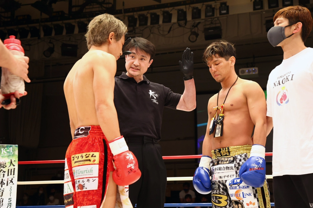 3R、山本は前に出て左ボディのヒットから顔へのヒザを突き上げ、大岩の足を止める。大岩も左フック、右ストレートで打ち返すが、山本は再び顔へのヒザ蹴り。ボディフックも効かせる山本だが、大岩はまたすぐ回復して左右のフックを振るう。そして山本が追いかけてきたところへ右フックをクリーンヒット。これで山本をなぎ倒し、終了時間ピッタリでKO勝利を決めた。