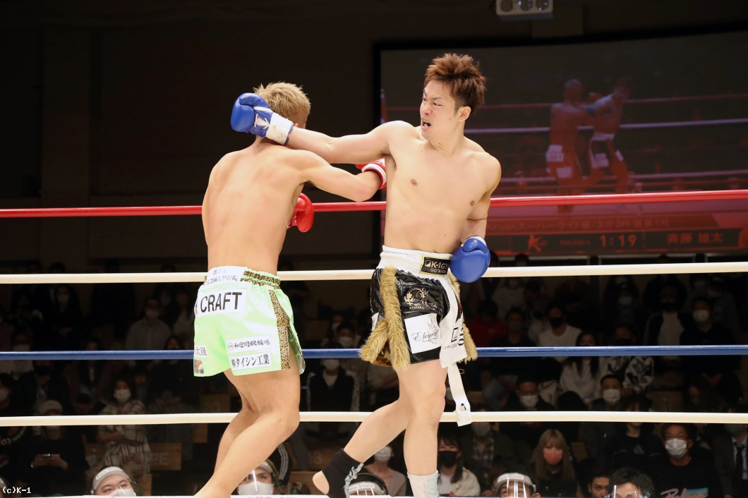 1R、斉藤は手を前に出した構えから変則的な右ストレート、左フックを放って当てるが、小嶋は冷静さを失わず、ボディフックを打ち込んでジワジワと斉藤に迫る。斉藤をロープに詰めて小嶋は左ボディフックを再びグサリ。小嶋は後ろ回し蹴りを放ち、再度ロープに詰めて左に加え右ボディフック。右ストレート、左フックと斉藤への攻め手を緩めない。斎藤もパンチを返して当てるが、小嶋はボディフックで削っていく。