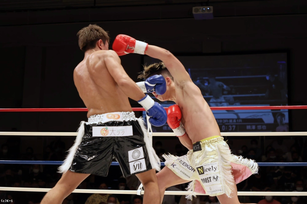 1R、ともにサウスポーからまずはローの蹴り合い。打ち気の鵜澤は左カーフから左ストレート、右フックと強振。橋本はしかししっかりガードして右フックのカウンターを返す。鵜澤は依然左ストレート、右フックと振り、胸を合わすと橋本を押していく。