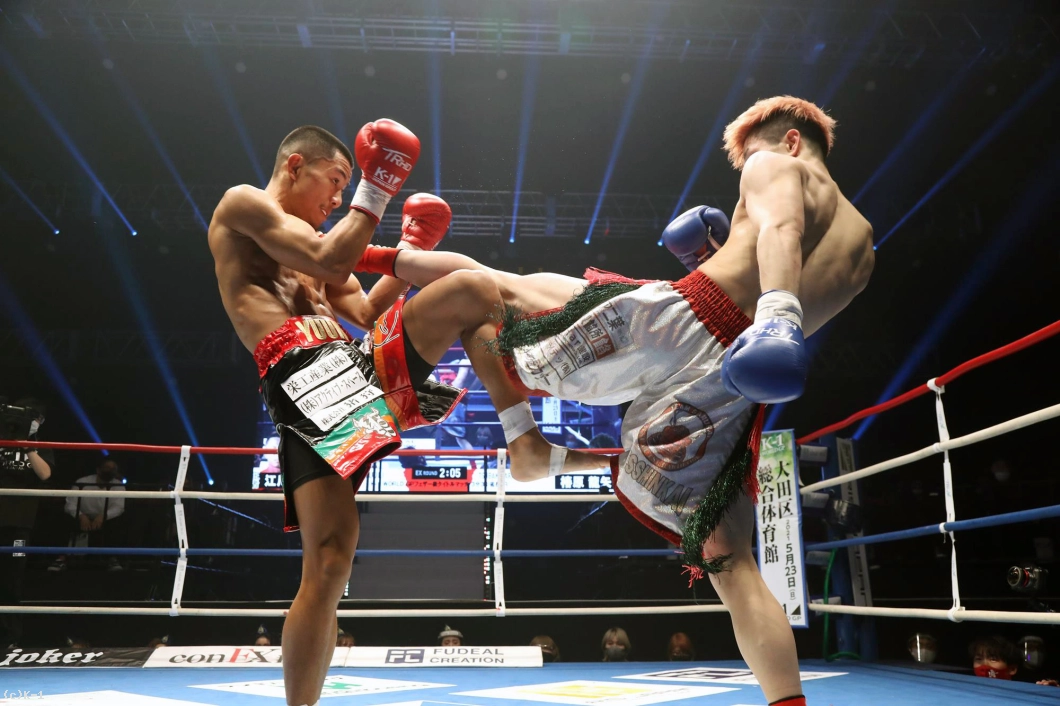 3R、江川はミドル、椿原は前蹴り。江川はミドルを出しながら前に出ようとするが、椿原はステップワークでかわし、ハイキックも繰り出す。中盤以降、江川はパンチの手数を増やし、前進して連打に行こうとするが、椿原は距離を保ちつつ左右のパンチを突き出し、ハイも交えて応戦。判定は椿原に1票入ってのドロー。決着は延長Rに持ち越された。
