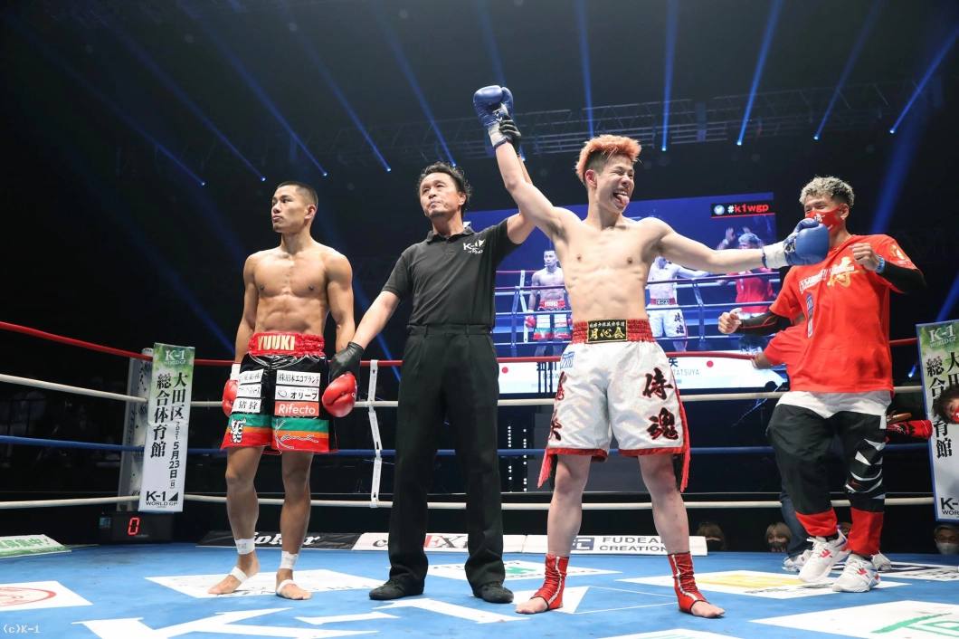 (延長は取った気持ちはあった?)やってる途中はなんとも思わないんで、絶対勝ってやるっていうぐらいには思ってました。(入場の時からかなり楽しそうというか、リラックスした表情だったが、どんな心境だった?)実は僕、今までにないぐらい緊張しとって、1R終わった時はめちゃ動きが硬かったんちゃうかなっていうふうに思うんですけど。K’FESTAっていう僕が思う最高の舞台にメインに出させてもらって、『こんなもん楽しまな損やな』っていうぐらいの『笑うしかないで!』ぐらいの気持ちでやってました。