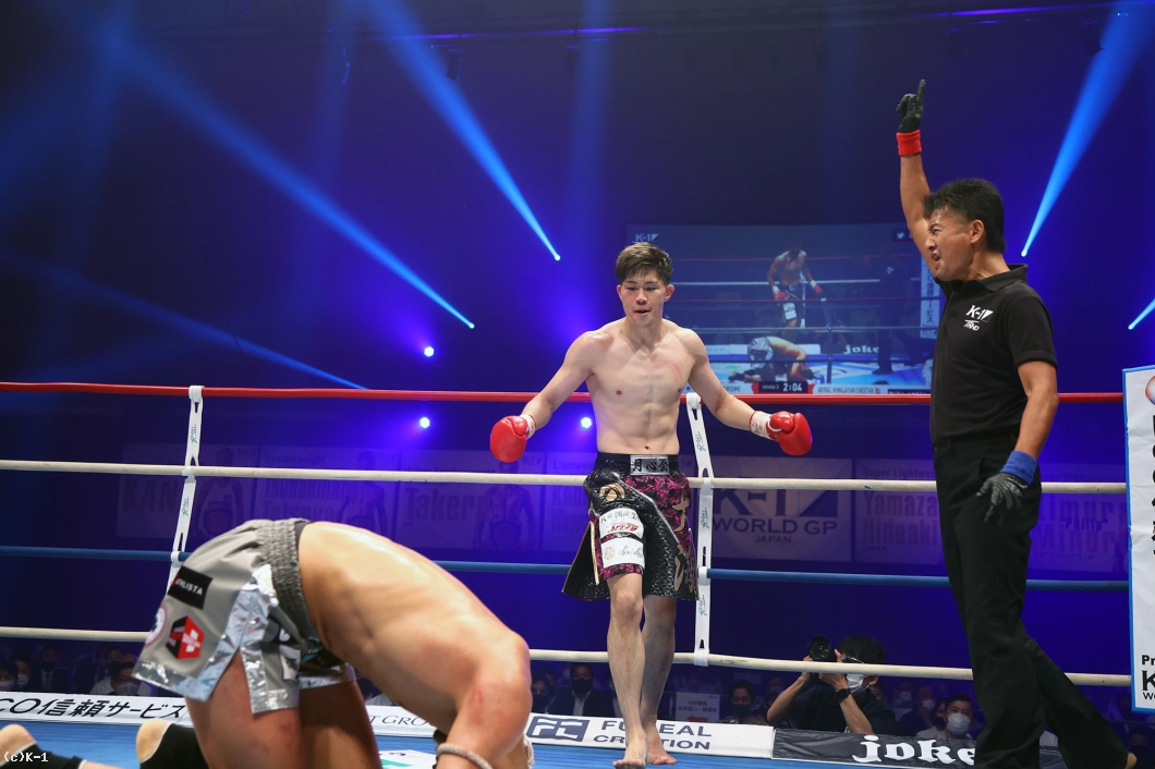 「(試合の感想は?)自分が弱かったです。(相手の印象は?)昨日会見で言った通り、パンチvs蹴りになって、蹴りに負けちゃいましたね。(これまで味わったことのないようなローだった?)初めてでしたね、こんなローもらって。最初にダウンを取って、ローブローをもらって、そこからちょっと試合が変わっちゃって、ローをもらいすぎましたね。(これからは?)ここからまた、ゼロからやり始めて、新しい自分を作って、また戻ってきたいですね。(ファンの方へメッセージを)今回、初めてKO負けしちゃったんですけど、またゼロからやり直して、また新しい自分を作ってK-1のリングに戻ってくるので、応援よろしくお願いします」