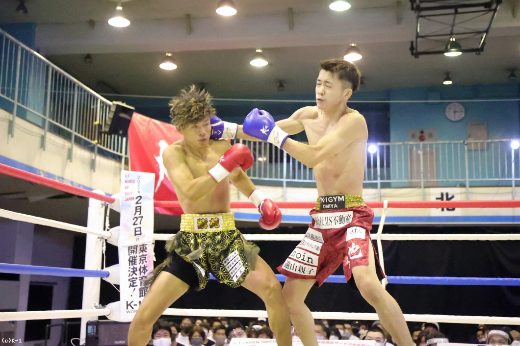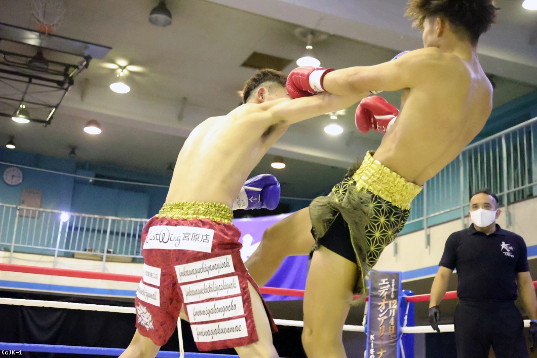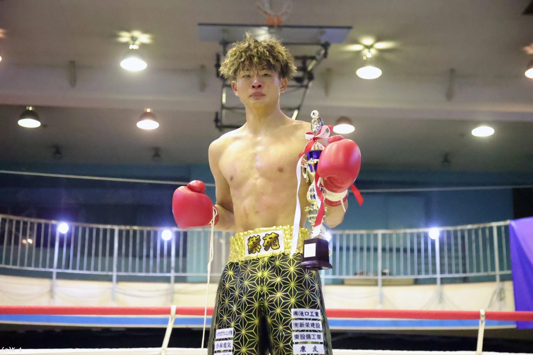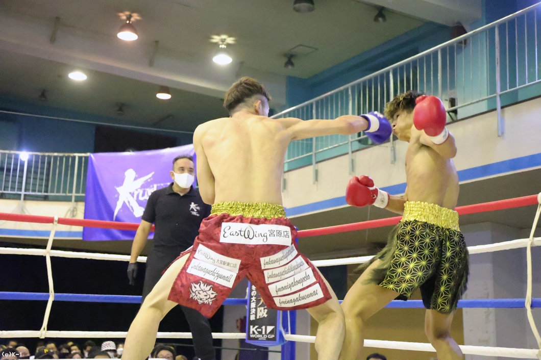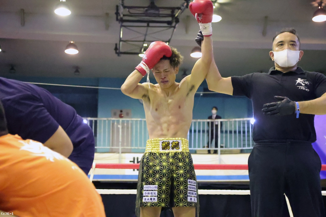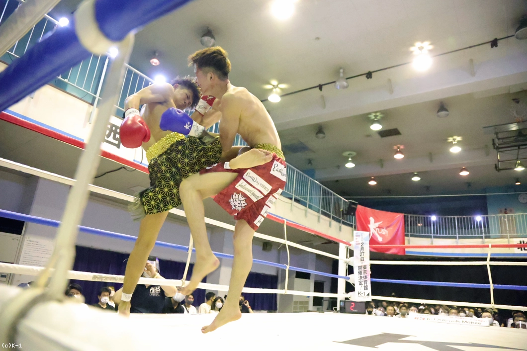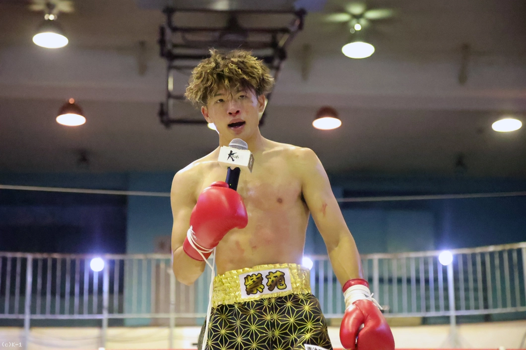 「応援してくれたみなさんありがとうございます。本来より一階級上の試合で、圧力があって最初は倒されたんですけど最後は倒せてよかったです。(対戦相手の印象は?)映像ではそこまで威力がなさそうと思ったんですけど、ジャブ・ストレートをもらって効いて、威力がありました。(今後の目標は?)K-1チャンピオンを目指すんですけど、一個一個段階を踏んで。欲しいベルトがあるんで、そのベルトを取ってK-1に殴り込もうと思っています」