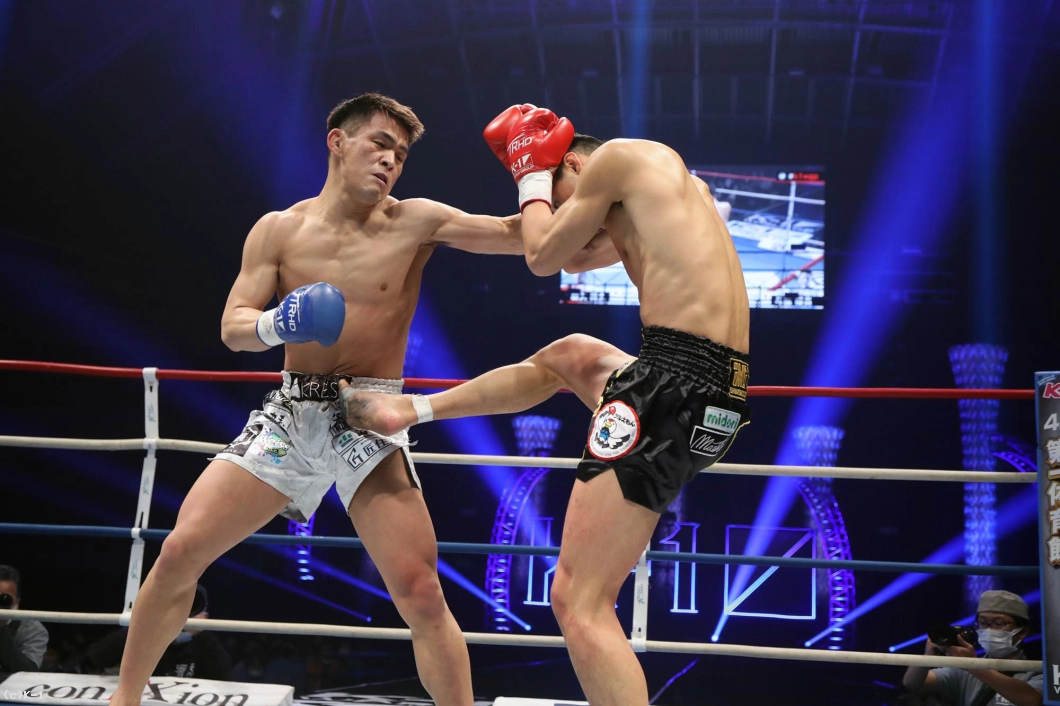 2R、与座が朝久の顔面へ前蹴り連打。朝久の入り際に与座がローを合わせ、朝久がバランスを崩す。与座の奥足へのローがローブローとなり一時中断。再開後は朝久が右テンカオで距離を詰めると、与座は奥足への左ローで応戦。至近距離で左ヒザを朝久のアゴへ叩き込む。朝久は距離を詰め左右フックを与座のガードに叩き込むが、与座は要所で左ローを返し朝久の足を削る。