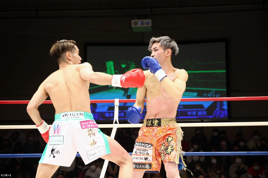 2R、橋本は再び左ハイを放つが中澤は手を下げず当てさせない。橋本は左インローを連続で当て中澤の前進を阻んでいたが、中澤は橋本がロープを背にしたところで右ストレート、右フックと畳み掛けダウンを奪い返す。