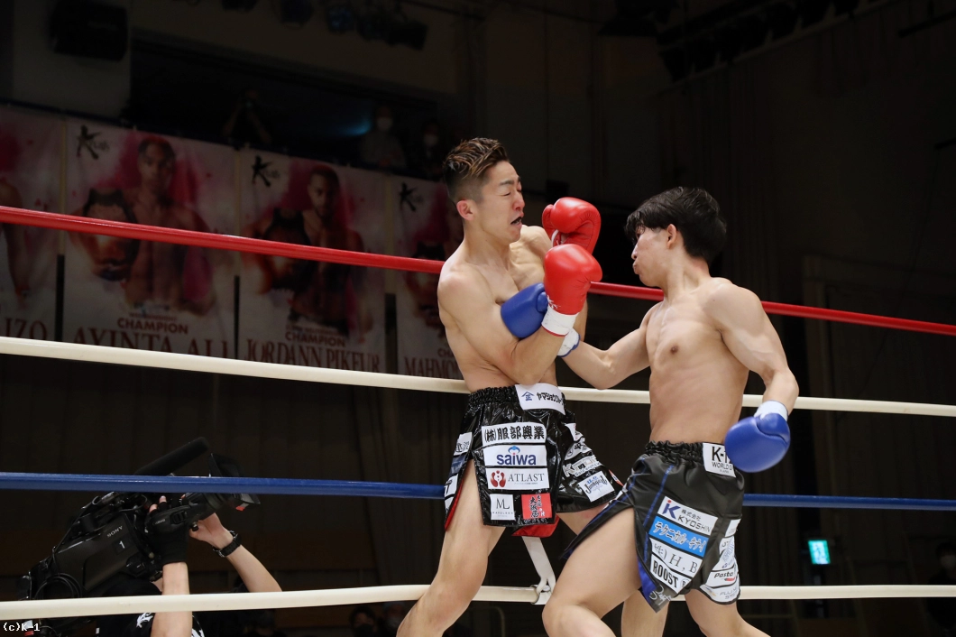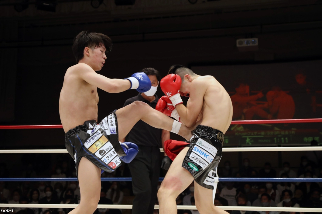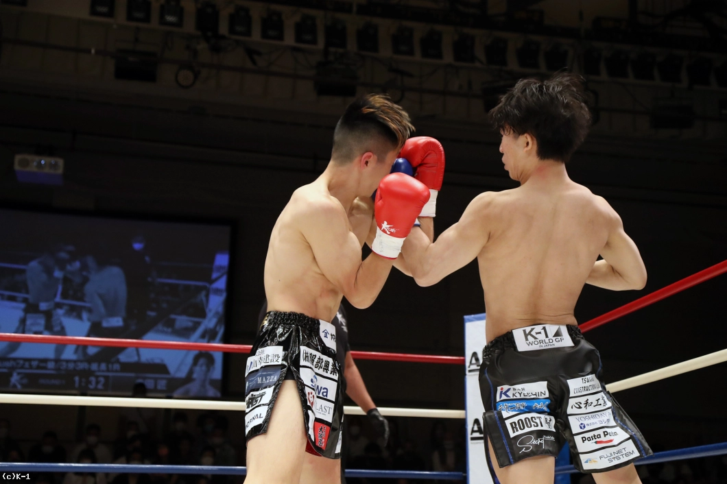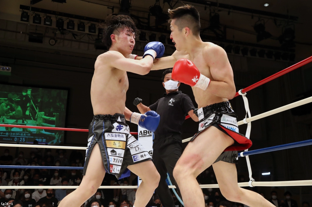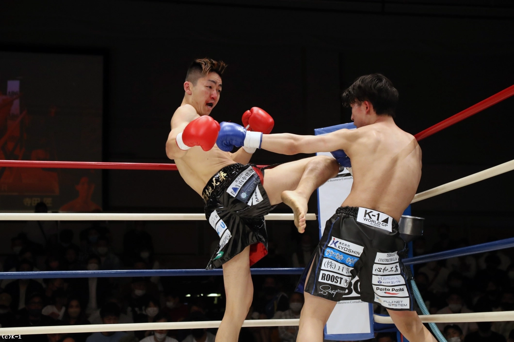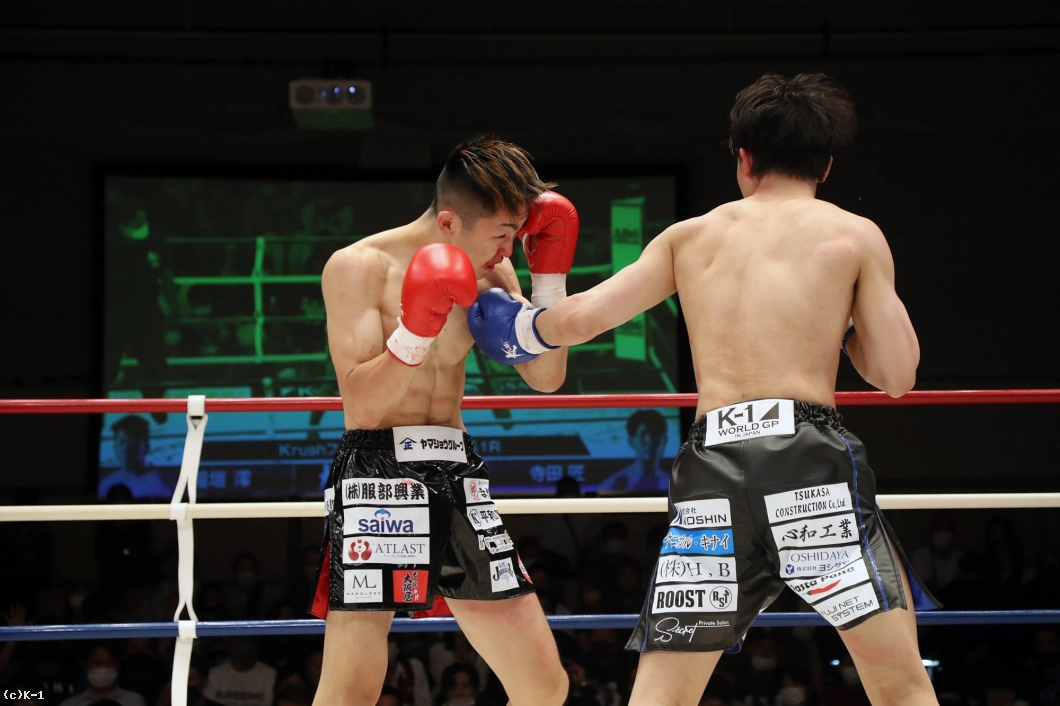 1R、両者まずローの蹴り合いからスタート。寺田はボディフック、アッパーとパンチを打ち分け、そこから右フックでダウンを奪う。立ち上がった稲垣に寺田は再びボディから顔への左フックを打ち込み、顔面前蹴りでも稲垣を襲う。稲垣は鼻血が見られる。