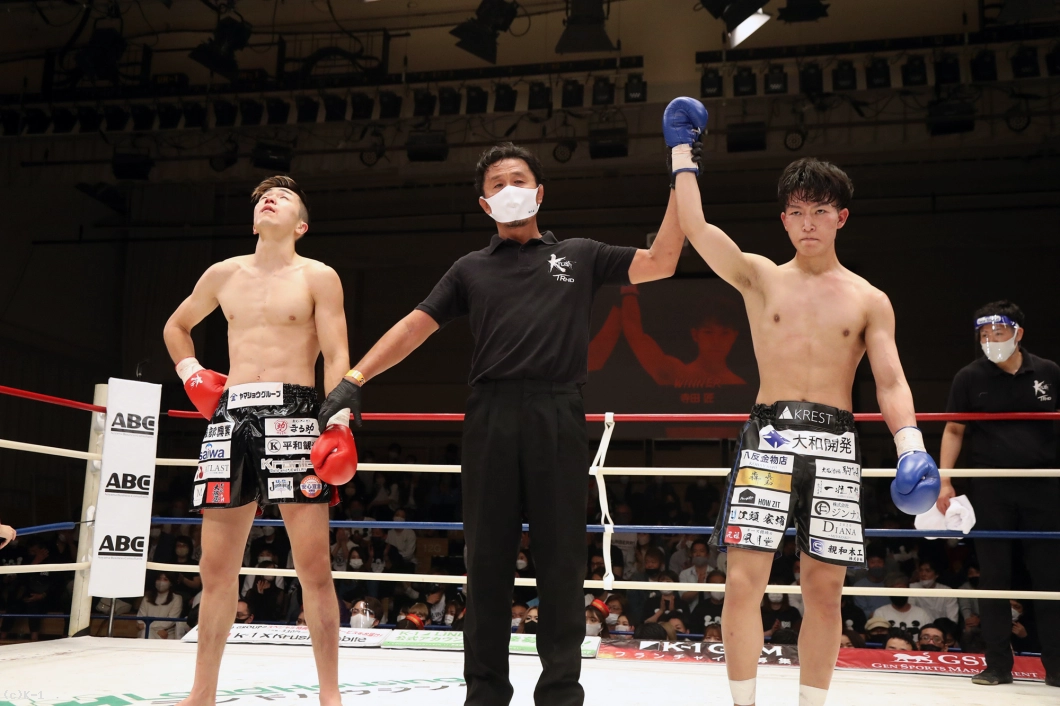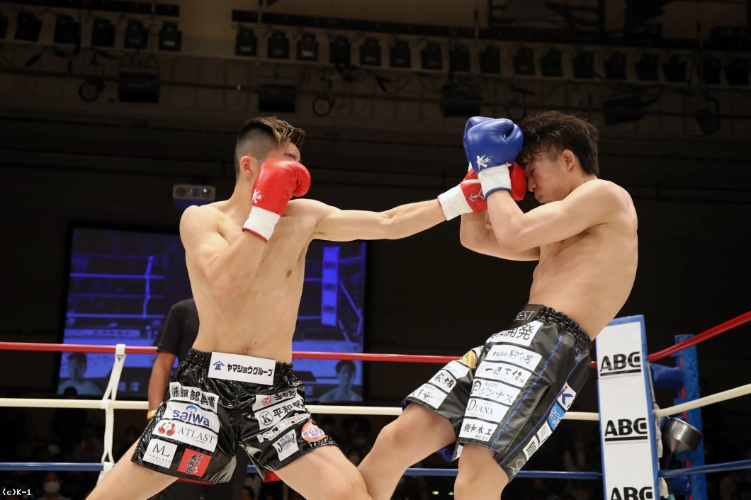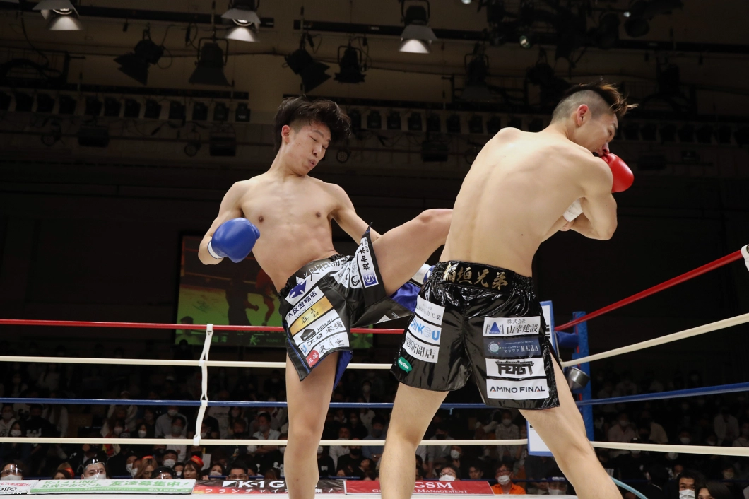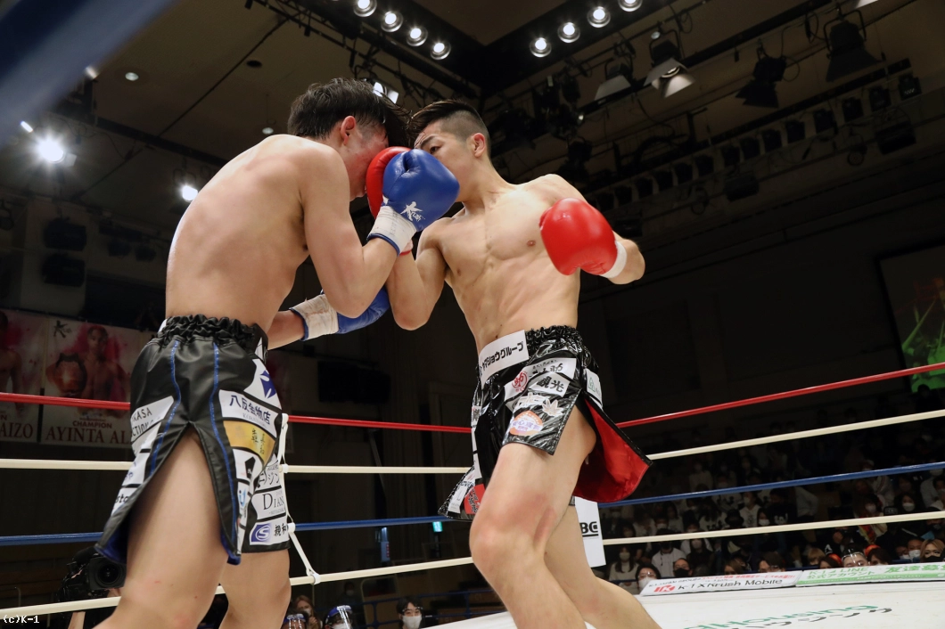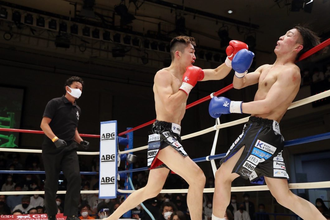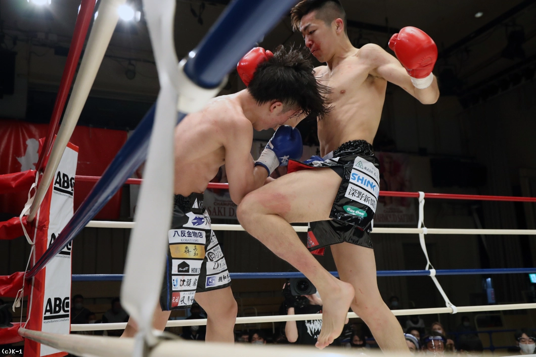 1R、両者まずローの蹴り合いからスタート。寺田はボディフック、アッパーとパンチを打ち分け、そこから右フックでダウンを奪う。立ち上がった稲垣に寺田は再びボディから顔への左フックを打ち込み、顔面前蹴りでも稲垣を襲う。稲垣は鼻血が見られる。