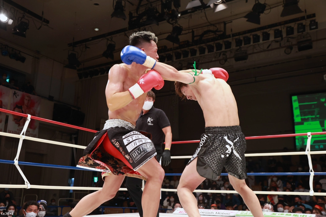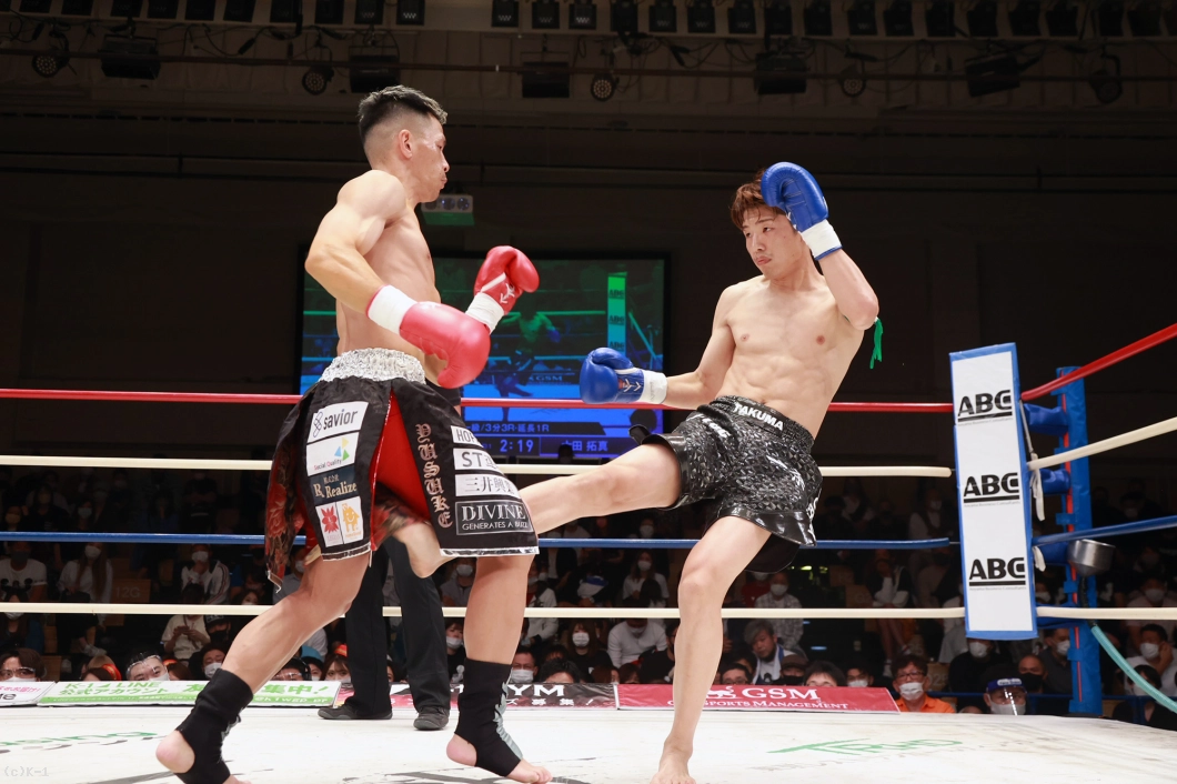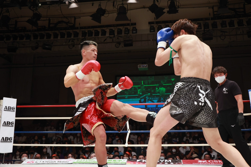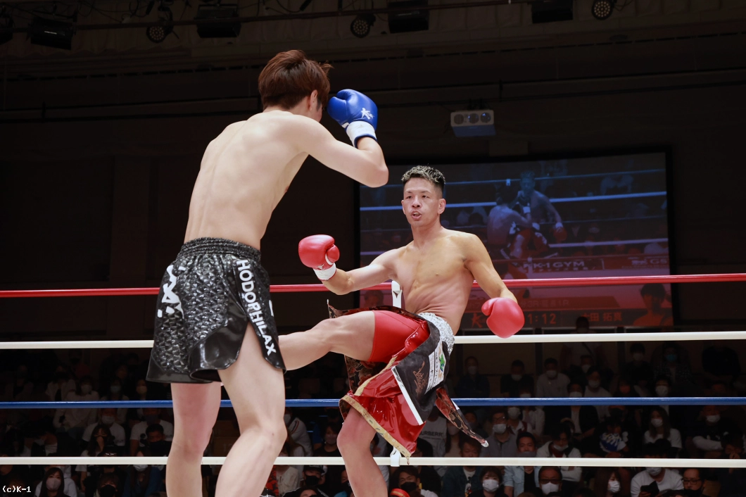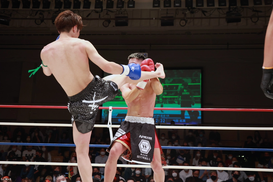 1R、サウスポーの大田は距離を取って立つ。佑典はそこへ思い切りよくアッパーを振るっていく。大田は右ロー、ボディストレート。佑典が迫らんとしても大田は蹴りの間合いを崩さず、ミドル、ハイと当てていく。2R、佑典が左ストレートを当てるが、大田も右ストレートを返して当てる。佑典は大田が作る間合いを飛び越え、左ストレートで襲う。だが、大田はクリーンヒットさせない。逆に右ミドルを佑典の左腕に当てていく。