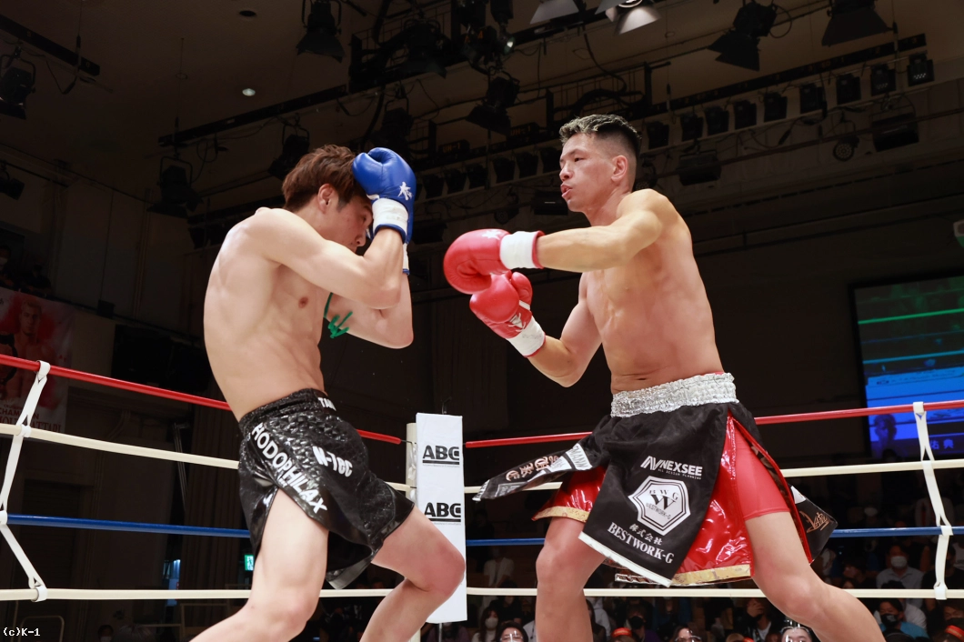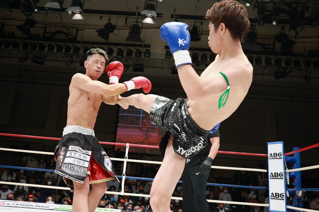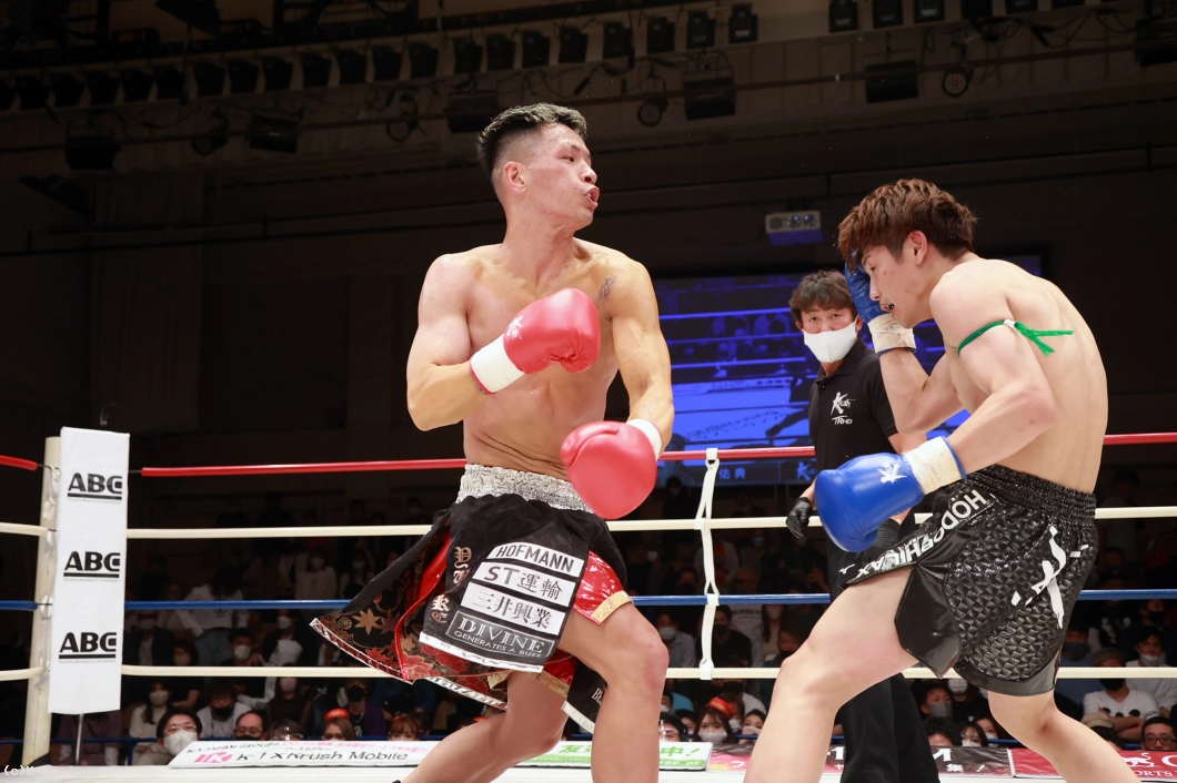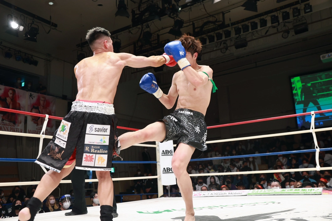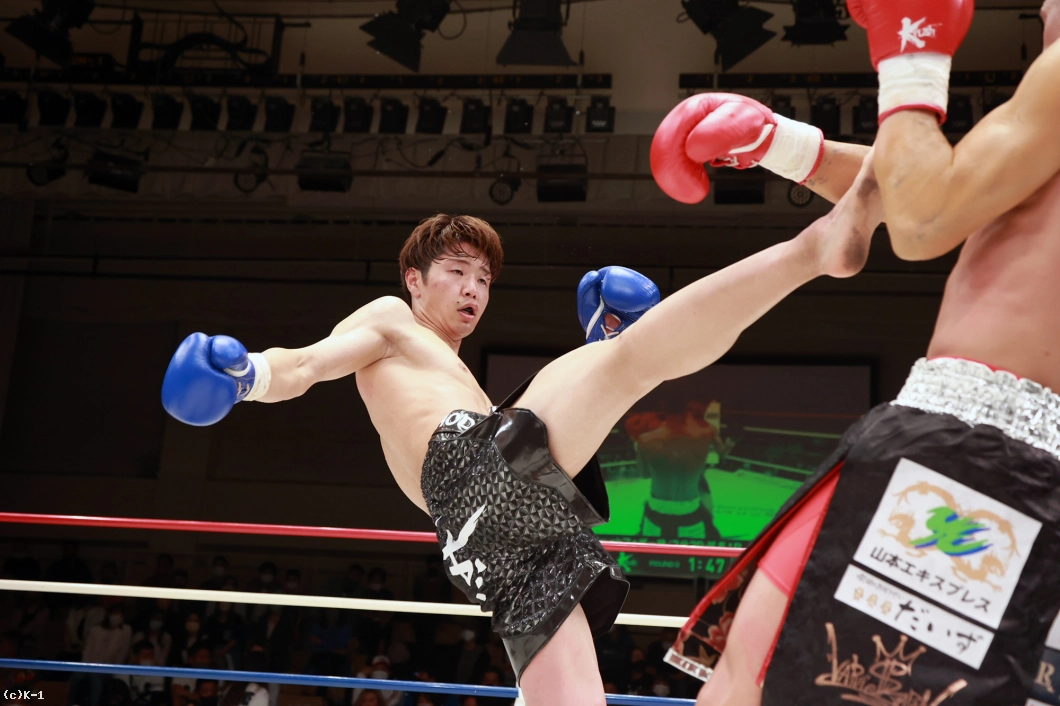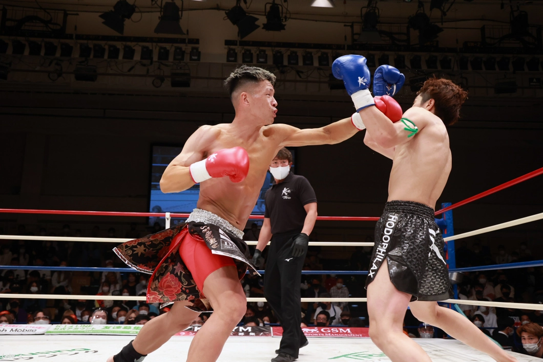 1R、サウスポーの大田は距離を取って立つ。佑典はそこへ思い切りよくアッパーを振るっていく。大田は右ロー、ボディストレート。佑典が迫らんとしても大田は蹴りの間合いを崩さず、ミドル、ハイと当てていく。2R、佑典が左ストレートを当てるが、大田も右ストレートを返して当てる。佑典は大田が作る間合いを飛び越え、左ストレートで襲う。だが、大田はクリーンヒットさせない。逆に右ミドルを佑典の左腕に当てていく。