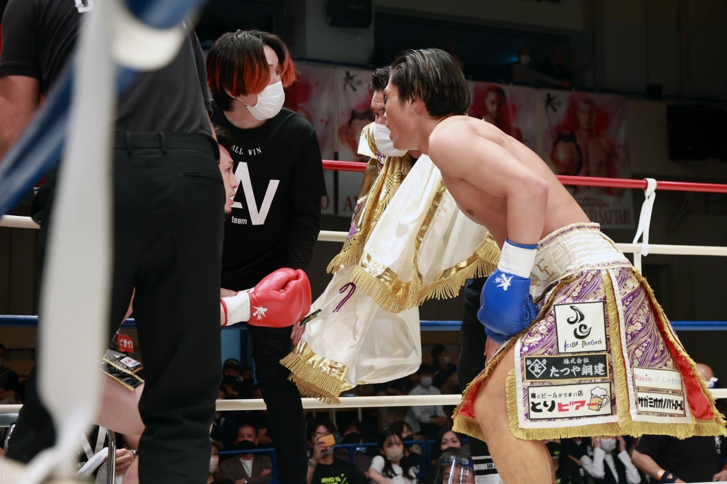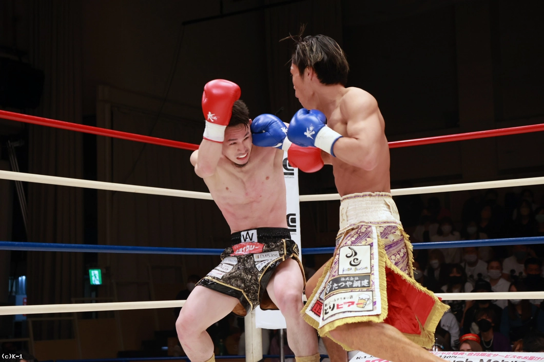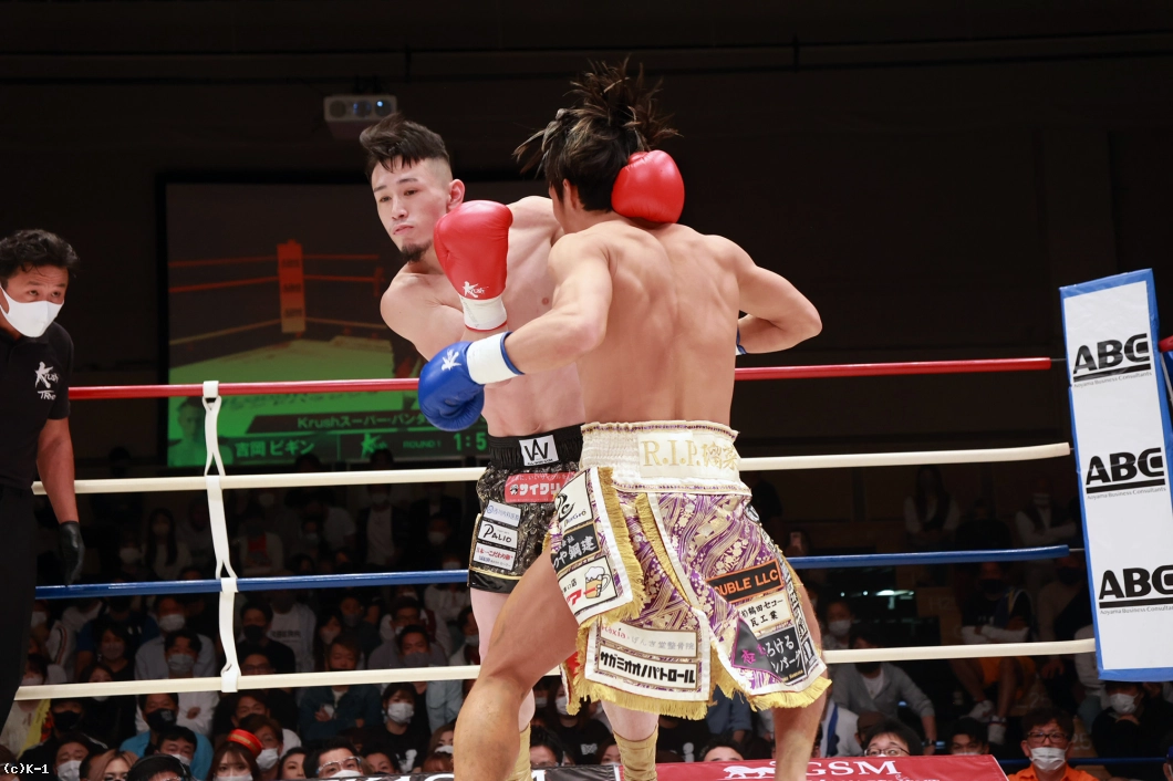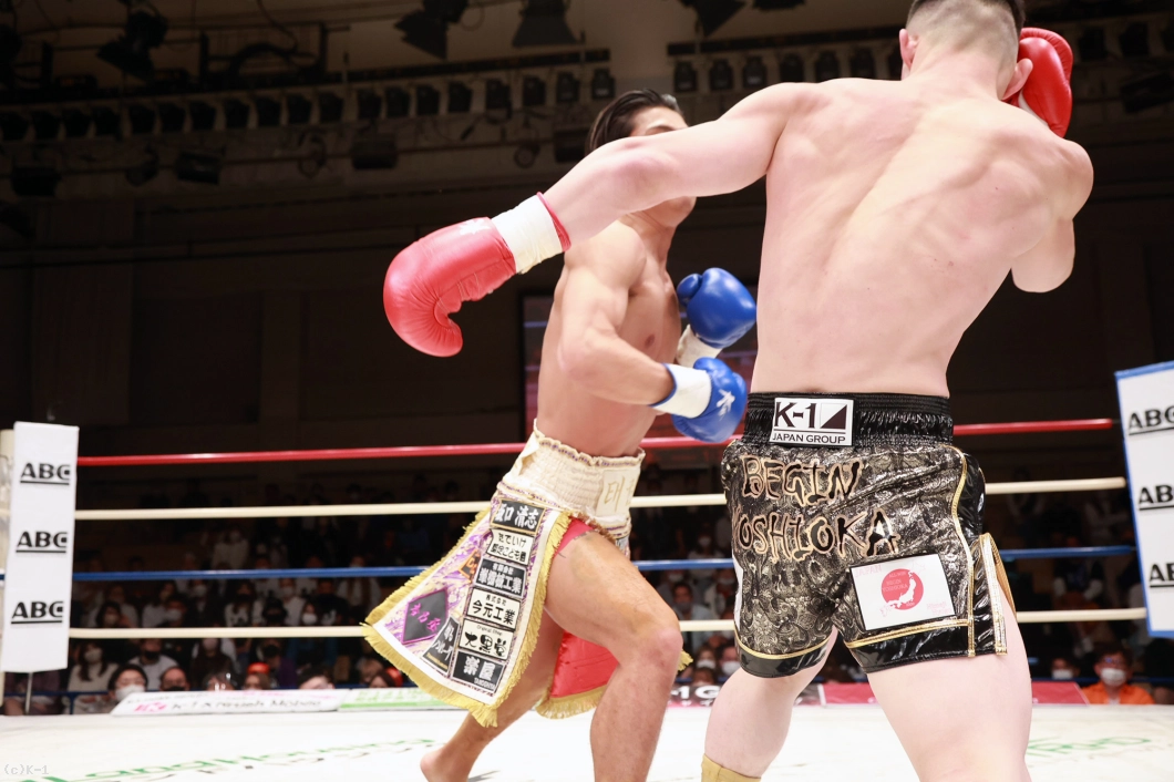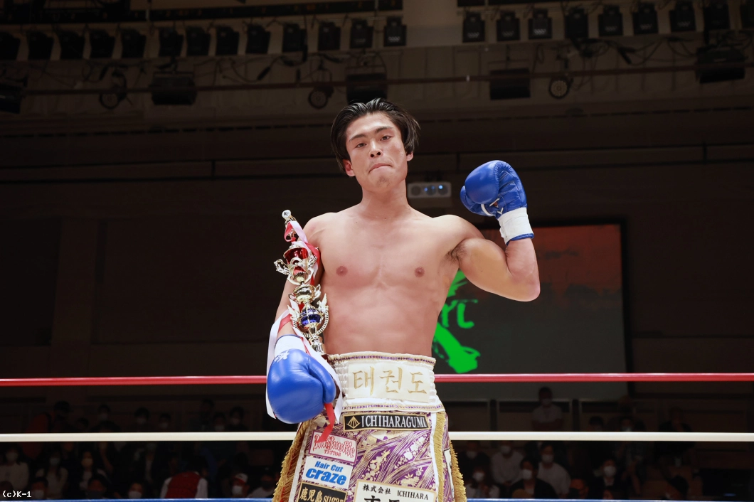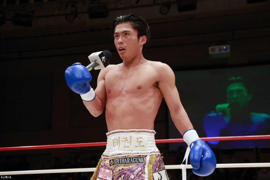 「最初から自分の距離で戦えていたので、これは負けることはないだろうって確信がありました。途中からどうKOするかにシフトチェンジしてたんで、倒すのは最低目標で。足技で派手に倒したかったけど、パンチでいきました。(対戦相手の印象は?)元チャンピオンで強豪にも勝っているので、そこは評価していましたけど、最初から自分とはレベルが違うと思っていたので、それをリングで体現出来てよかったです。(3連続KO勝ちだが)どこまで連続KOを続けるかが課題なんで、二桁までのばしていきたいです。(今後の目標は?)一番近い目標は一回負けている璃明武にリベンジをかけたタイトルマッチを組んでもらいたいです。一回もダウンしてない吉岡選手をKOで超えたんで、挑戦者として文句ないだろうと思うので、タイトルマッチを組んでほしい。もし組まれたら璃明武選手をボコすだけです」