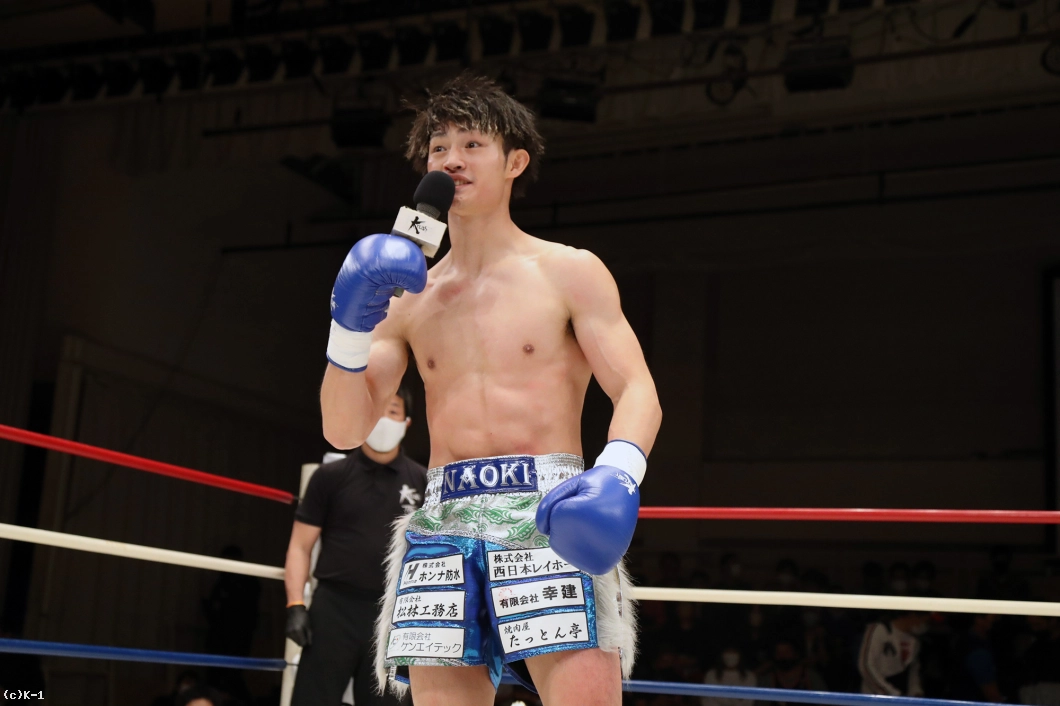 「60kgに上げて1戦目になるんですけど、KOで飾ることができました。57.5kgの僕を見てた方は“あのブンブン野郎が?”って思ったと思うんですけど、60kgになったら一気に変わると思うので応援よろしくお願いします。来月、女子のK-1で妹(MOE)もやってくれると思うので、僕も繋げたってことで応援よろしくお願いします」