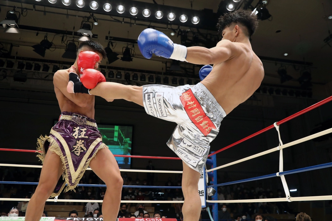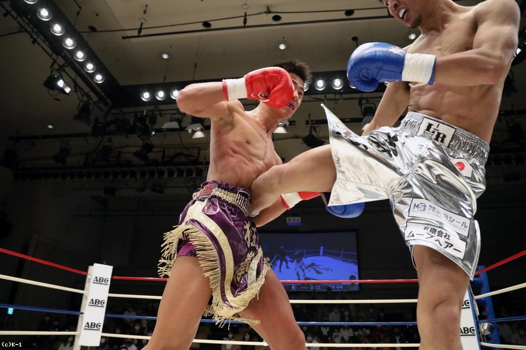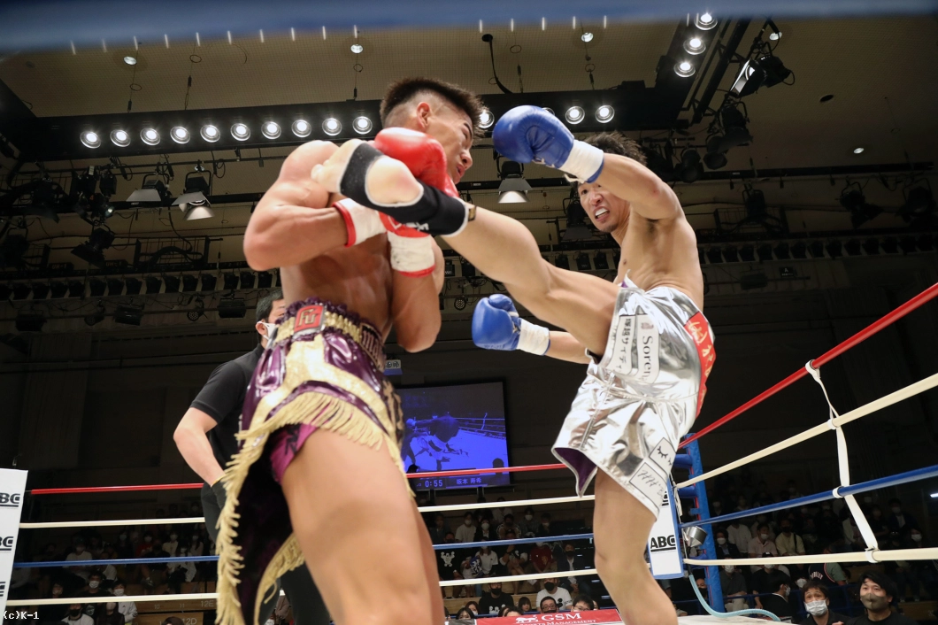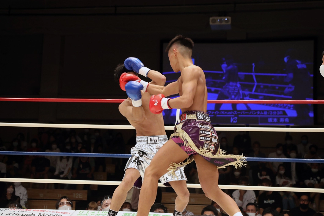 2R、迅は攻勢を強め、右ミドル、右ロー、右前蹴りと坂本にロープを背負わせ、右ストレートと左フックで狙う。坂本は逆に左ローで迅の前進をけん制するが、迅はタイミングのよい右ストレート・右フックで坂本を襲う。