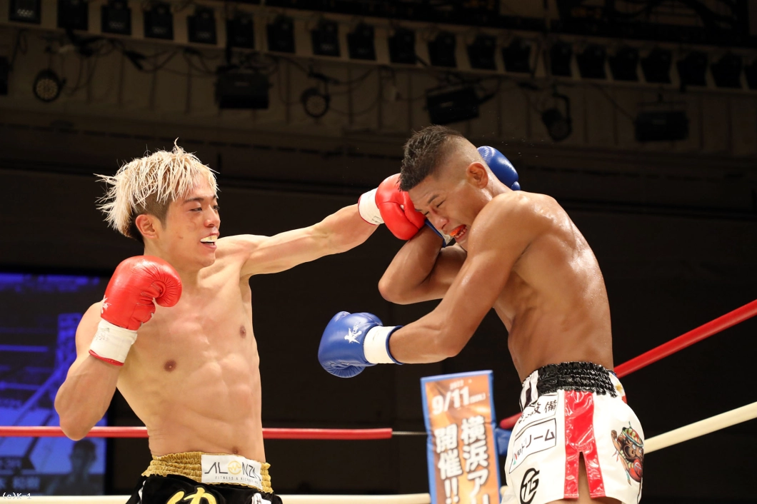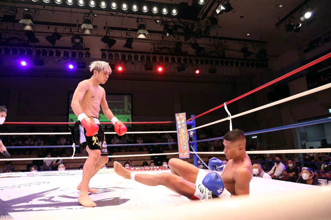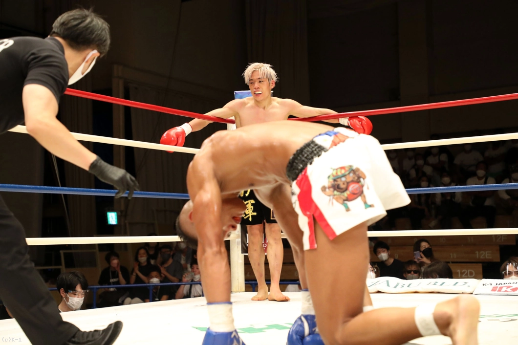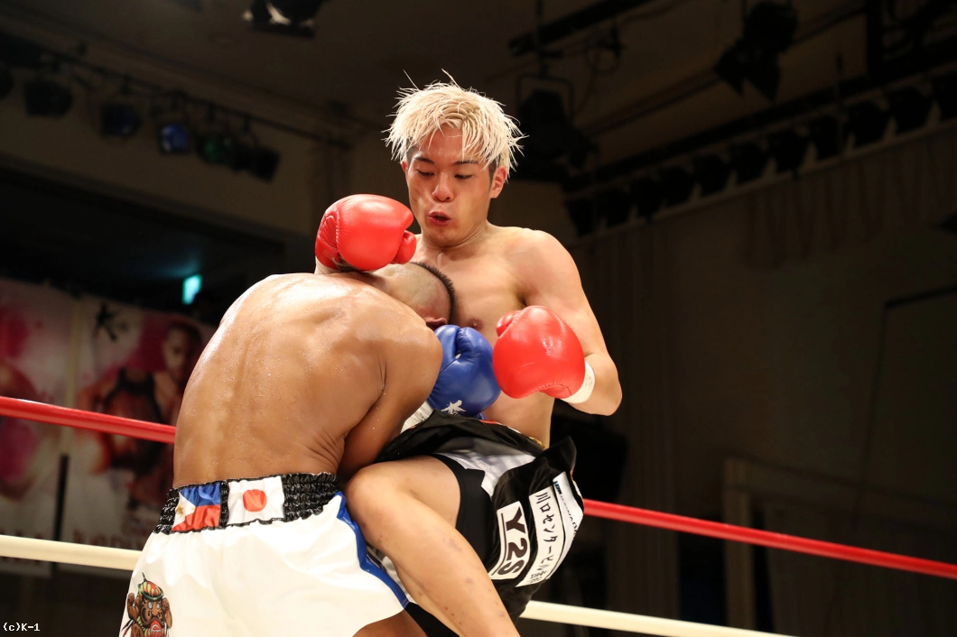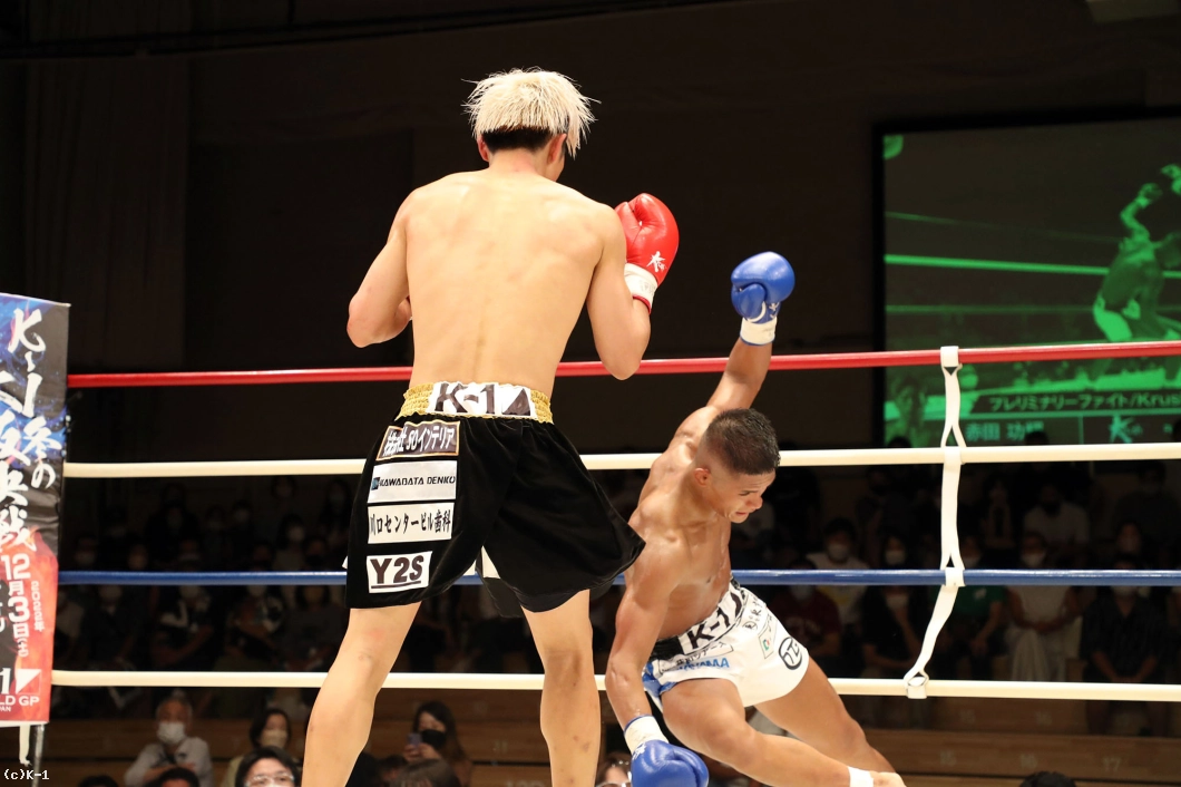 2R、赤田は松本をロープに詰めてボディへのヒザを効かせる。赤田を遠ざけたい松本だが赤田は下がらず、再度ボディへのヒザ。赤田はローも効かせていく。後退ベースとなる松本左ストレートを返すも力が落ちており、赤田は左ロー、左ストレートで攻める。3Rも赤田が前に出てプレッシャーを掛け左ローを効かせ、これでダウンを奪取。立ち上がる松本だが口が開いて力がなく、再び左ローにダウンを喫するとレフェリーが試合を止めた。