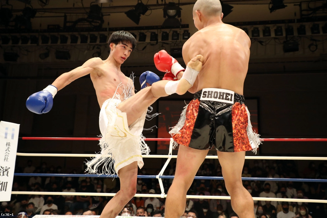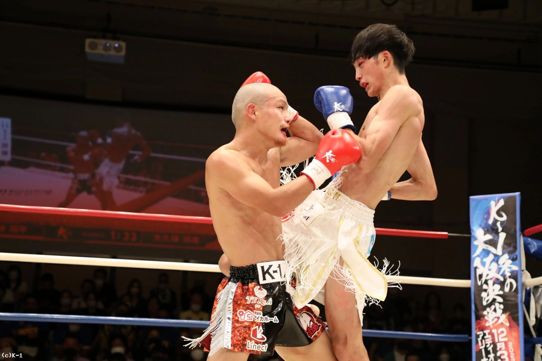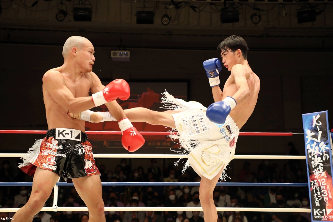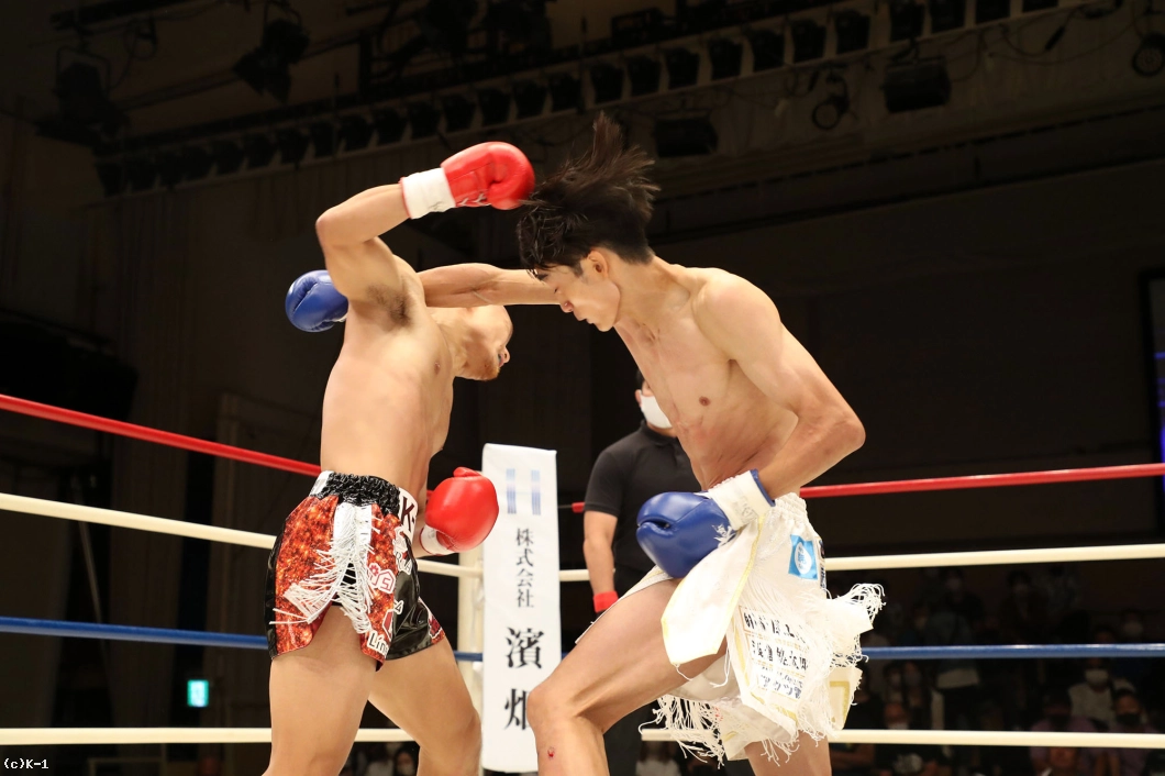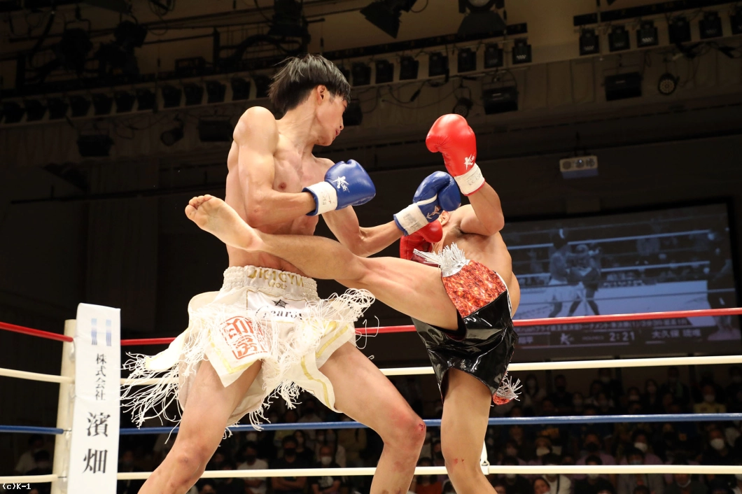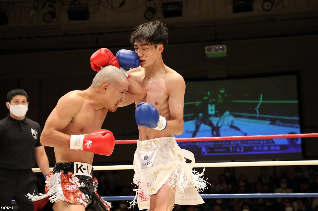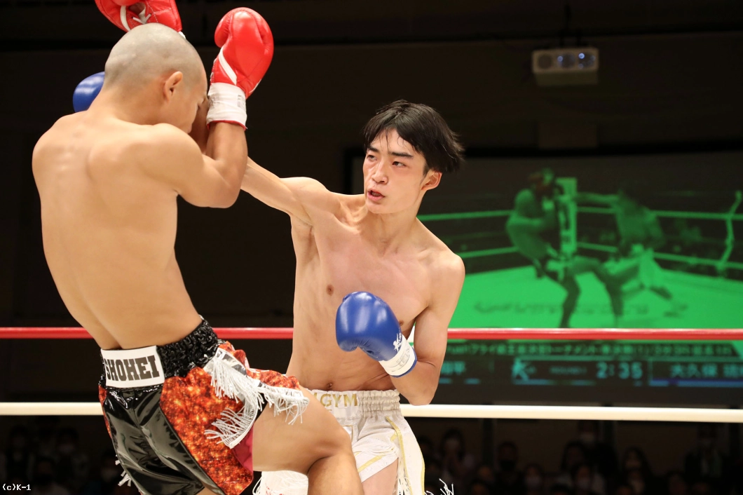1R、両者向き合うと身長差が際立つ。大久保は懐を深く保ち、ロー・ミドルを入れていく。リーチで劣る西林はパンチを当てるため距離を詰めたいが、大久保は間合いを保ってローとヒザ、ワンツーと振るう。2R、大久保は西林の攻撃をリーチ内で対処しながら前に出てくる。西林も大久保の前進に左右フックを振るって合わせる。大久保は熱くならず、被弾があっても打ち合いに行かず自分の距離での戦いを続ける。