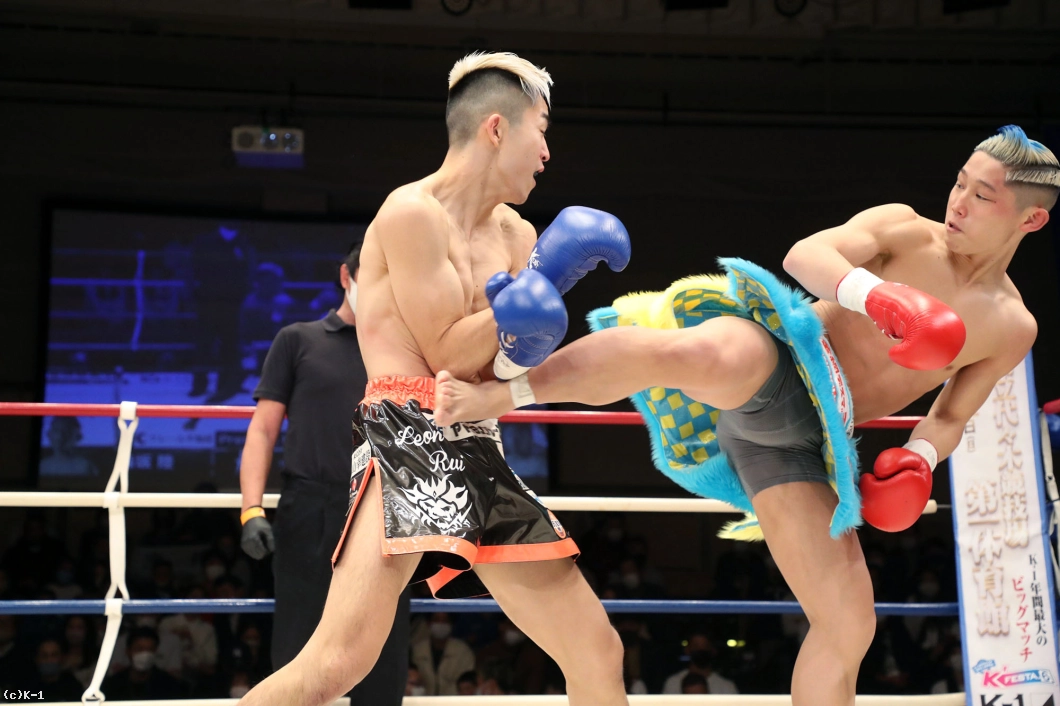 1R、左右のミドル・ローを放ってリングを回る森坂に対し、稲垣は長身の圧力を利して森坂に迫る。バックブローや飛びヒザとトリッキーに攻撃を繰り出す森坂だが、稲垣はディフェンスが固く破れない。