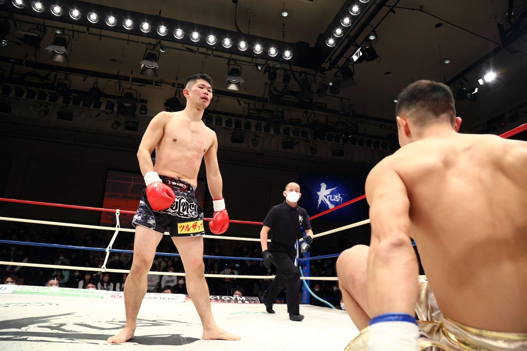 立ち上がった鈴木をロープに詰め右ストレートと左フックで迫る伊藤だが、鈴木も左フックのカウンターを振るう。だが伊藤はよく見て右ハイキック。これで鈴木の側頭部をとらえてグラつかせる。