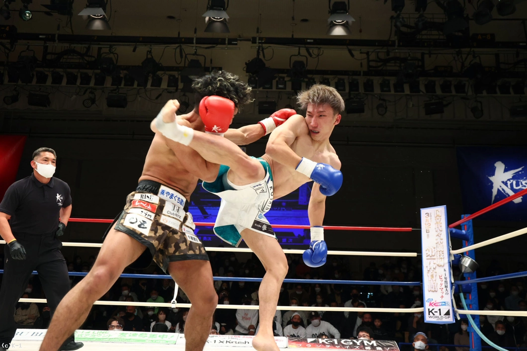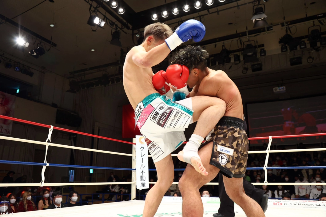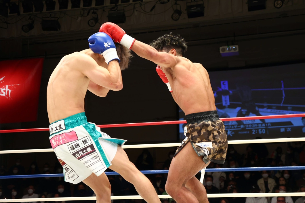 3R、銀次はステップを使ってリングを回る。だが林は右ストレート、右フックを強振して銀次を追う。林はどんどん間合いを詰めていき、近距離で左右フックの連打で迫る。消耗が見られる銀次。この疲れもあったか、掴んでのヒザを見舞ってしまい銀次はイエローカード=減点1を受ける。林はさらに左右フックで攻めて終了。