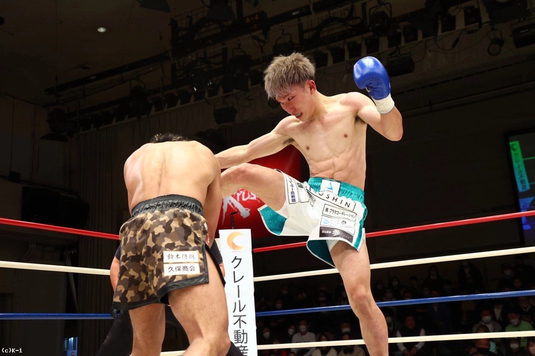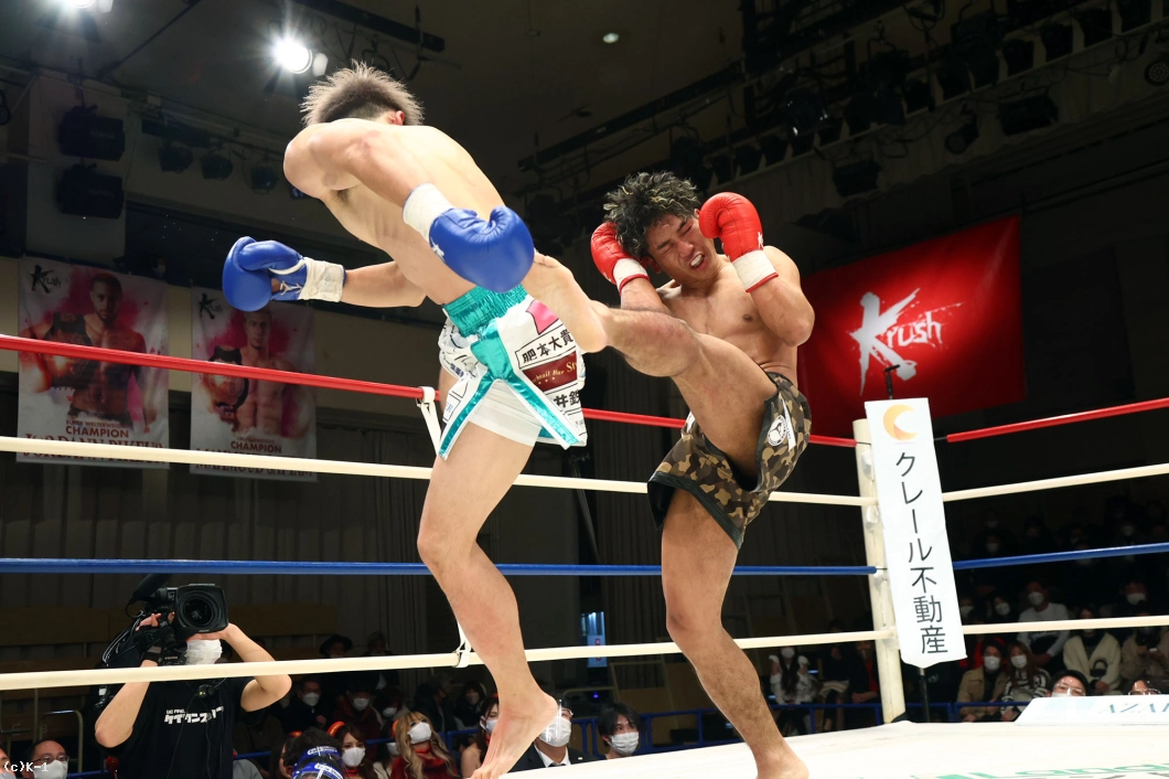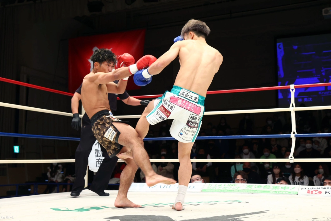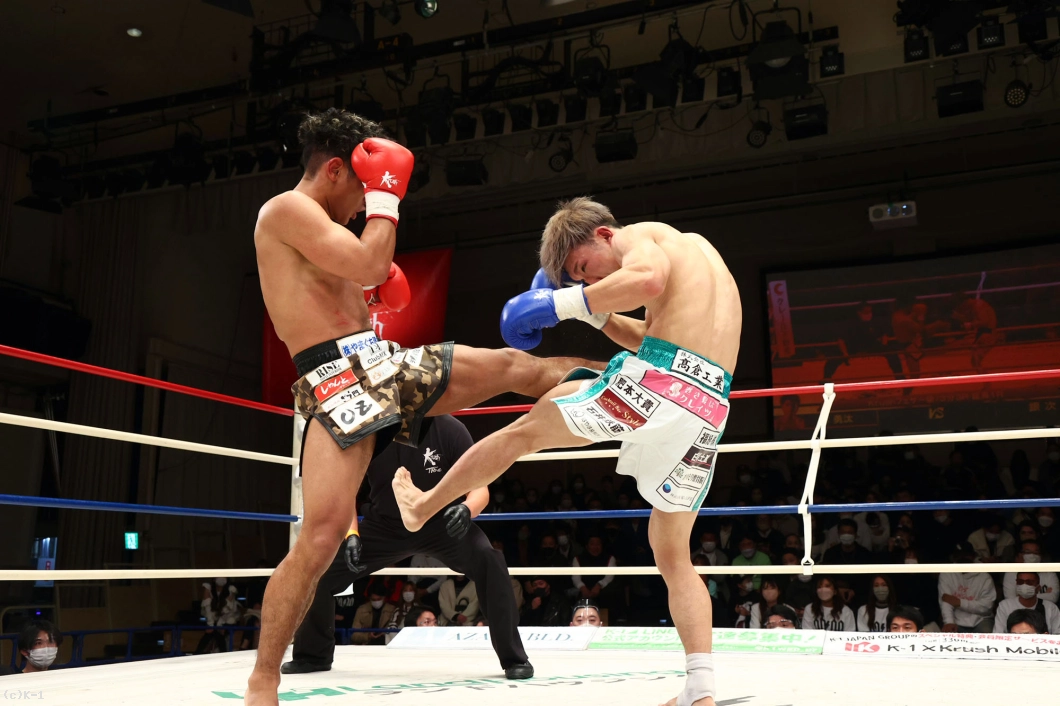 2R、試合はパンチの林vs蹴りの銀次といった様相に。銀次の蹴りをかいくぐり、林は左右フックでとらえていく。銀次の圧力に対処し切れなくなってきたか、銀次は近距離での戦いを強いられる。だが飛びヒザ、カーフキックと林に打ち込む。