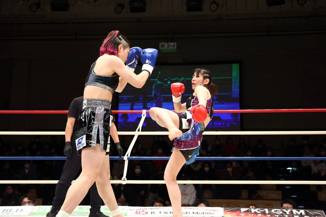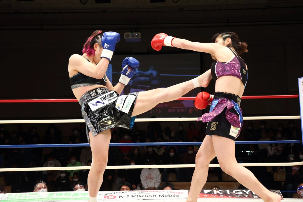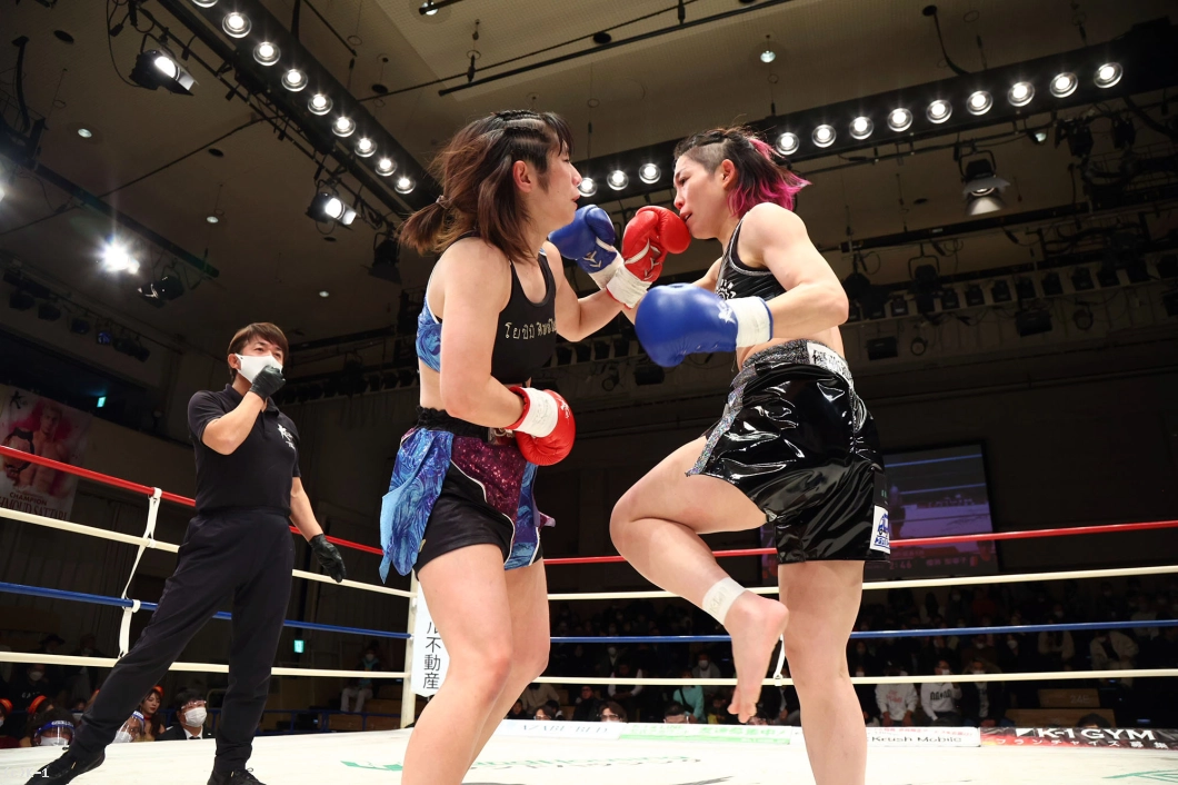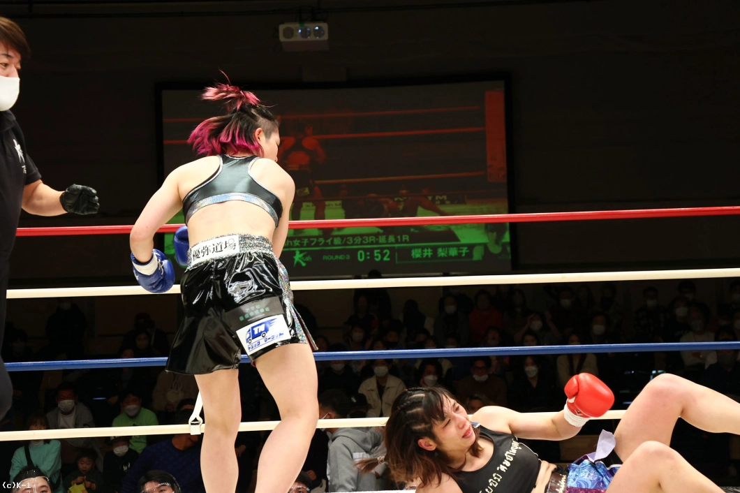 2R、櫻井は蹴りから左右ストレートを連係。次第に芳美へ圧力を効かせていく。芳美のカウンターを当てられても櫻井はパンチから繋いだ前蹴りで前に出る。構えをスイッチしカウンターで迎え撃つ芳美だが櫻井の圧力が勝り芳美を削る。