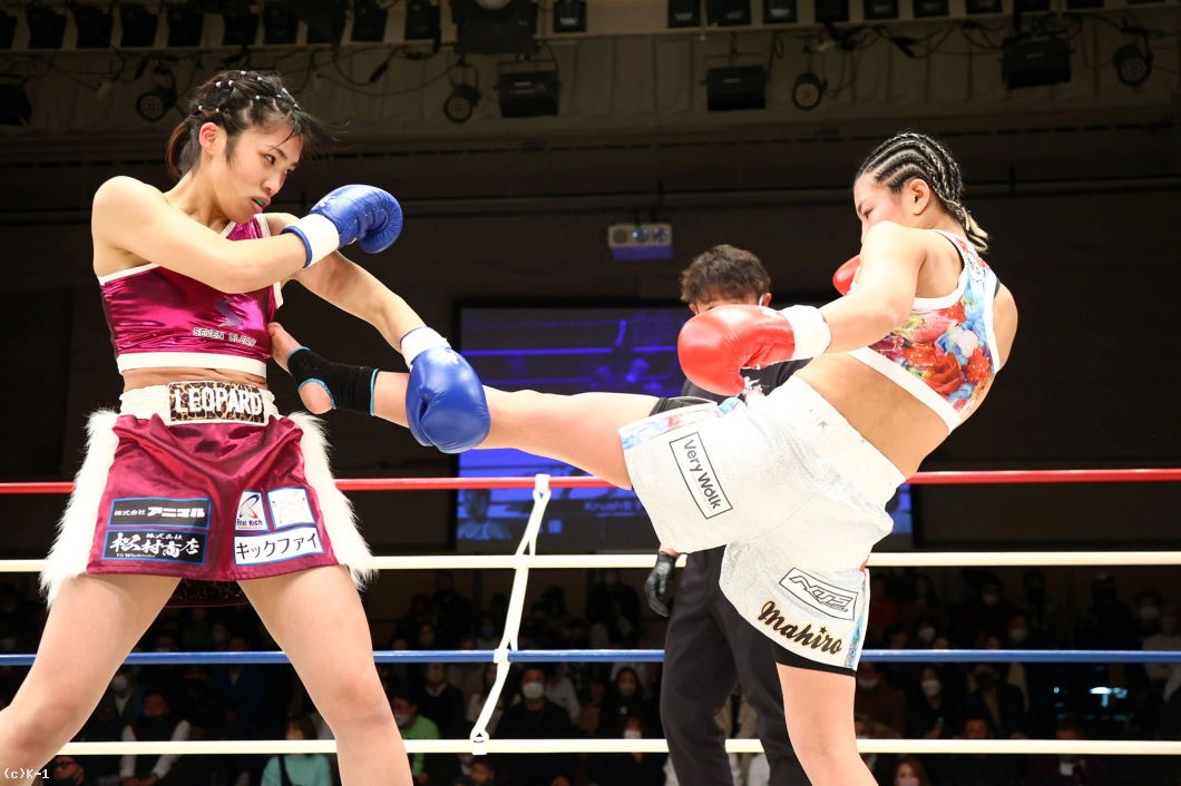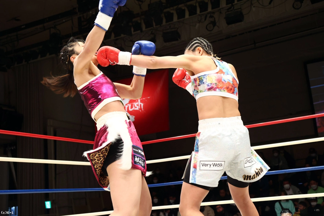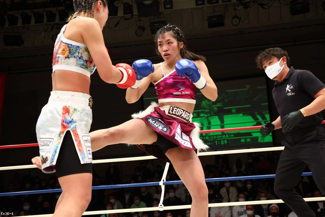 3R、前蹴りから接近して攻めんとする真優だが、麻央は近距離ではヒザを入れ、パンチからのミドルでとらえる。先手でパンチを入れ、ミドルに繋げる麻央が手数で上回る。だが両者度々バッティングとなってしまい、その度に試合が止まる。麻央は真優のミドルを足を上げてカットし、自身のミドルで真優のボディをとらえる。