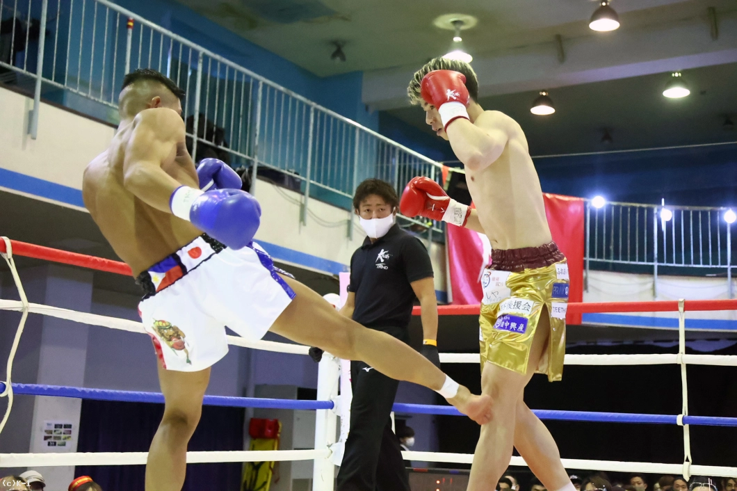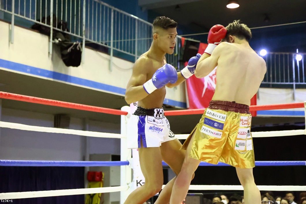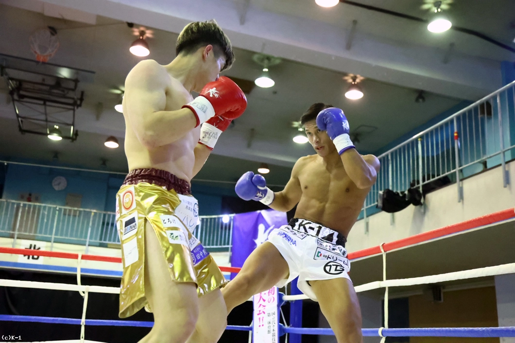 1R、サウスポーの松本はサイドに動いてローキック。佐野もじりじりと前に出て右ミドルを蹴る。松本は軽快なステップから左のパンチを当てると、そのまま佐野のボディにヒザ蹴り。これで佐野がダウンし、何とか立ち上がったもののレフェリーが試合をストップ。松本が2連続KO勝利を収めた。
