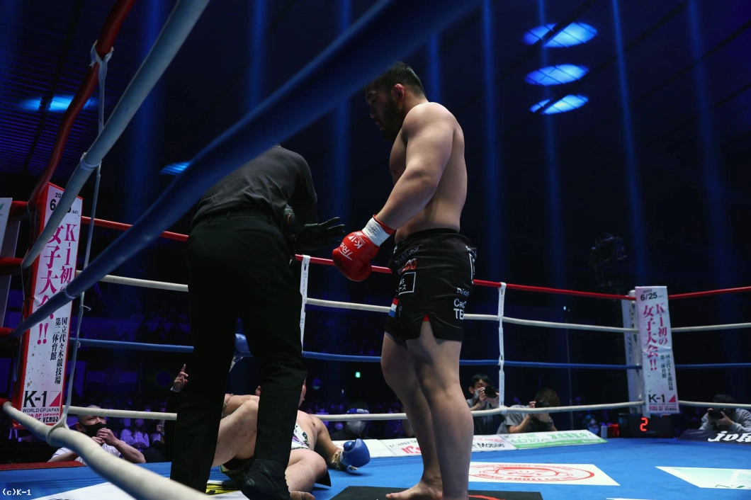 (結果的に石井選手はその後に棄権ということになりましたが)さっきしゃべったんですけど、『先に倒れてなかったら俺が倒れてたかもしれない』ということも言ってくださったし、いい負けというか、いい結果は残したのかなと思うんで、リベンジしたいですね。(パンチにヒザを合わせにいくのは作戦?)そうですね。作戦を立ててるうちでお腹が弱いというのは分かっているので、三日月蹴りとヒザはずっと作戦でした。(勝ち上がるよりも石井選手に勝つのが優先だった?)煽りVとかいろんなところでも言ってたんですけど、僕の中で石井選手はスーパースターで、どうしても勝ちたくて、勝ってから先のことを考えようと思ってたんで、ホントに石井選手だけ考えて練習してました。