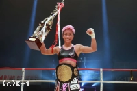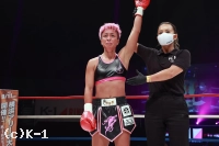 (K-1最強っていうのも絶対に言いたかった?)KOで勝って、絶対に言おうと思ってました。(ファンの方にメッセージを)今日は応援ありがとうございました。そして、K-1の女子の選手もみんな、ありがとうございました。これからも自分が女子の先頭を走って、K-1をもっともっと大きくしていくんで。このK-1の女子の舞台をみんなに目指してほしいと思います。これがK-1の女子のスタートだと思ってるんで、これからも応援よろしくお願いします。ありがとうございました」