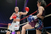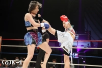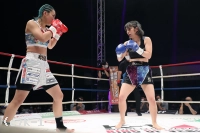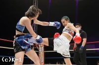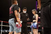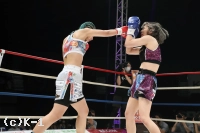 1R、芳美はサウスポーを基本にしながらオーソドックスへのスイッチも織り交ぜ前に出る。だが真優が右ハイキックをヒット。真優は前蹴りを打ち込み、芳美が入ってきたところに左右ストレートをカウンターで当てる。芳美はホールディングが重なり注意を警告を受ける。