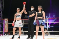 3R、前に来る芳美に真優はミドルから前蹴りを決め転倒させる。続けて右ストレートからの左フックでも芳美をとらえる。真優は芳美に対し距離を取りミドルを当てていく。真優はホールディングの警告を受けるが、ラウンド最後はミドルで攻め、芳美もパンチを振るって終了する。判定は30-28、30-28、30-27の3-0で真優。中断に集中力を切らさず勝利した。
