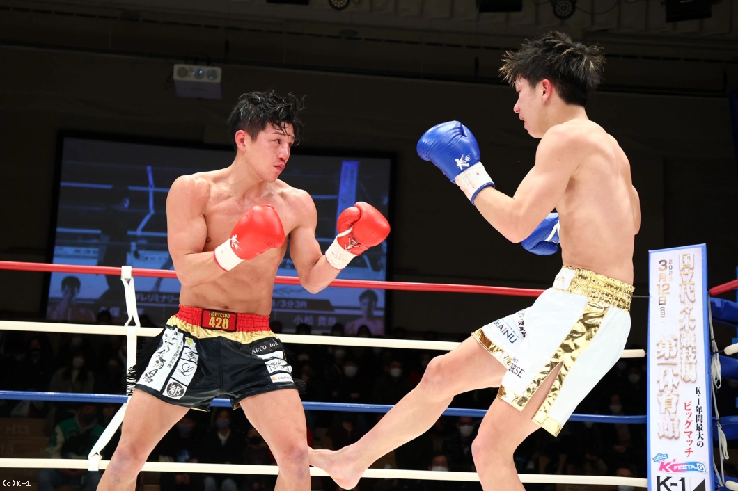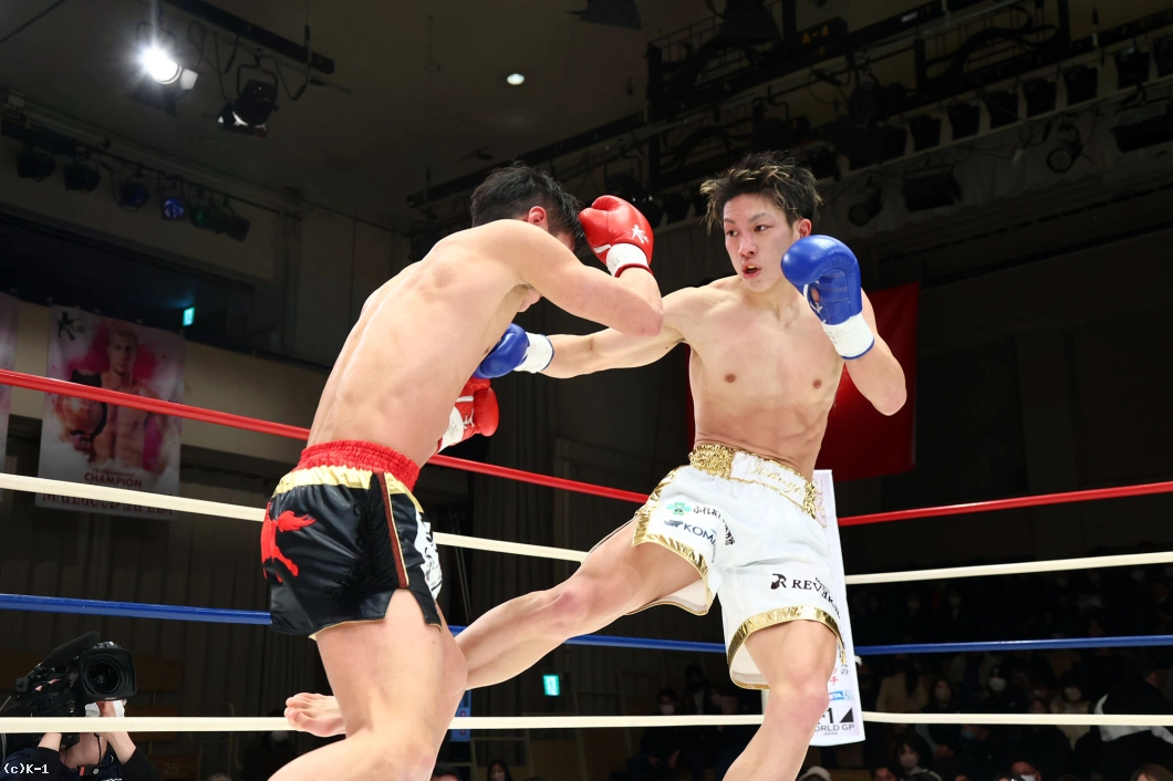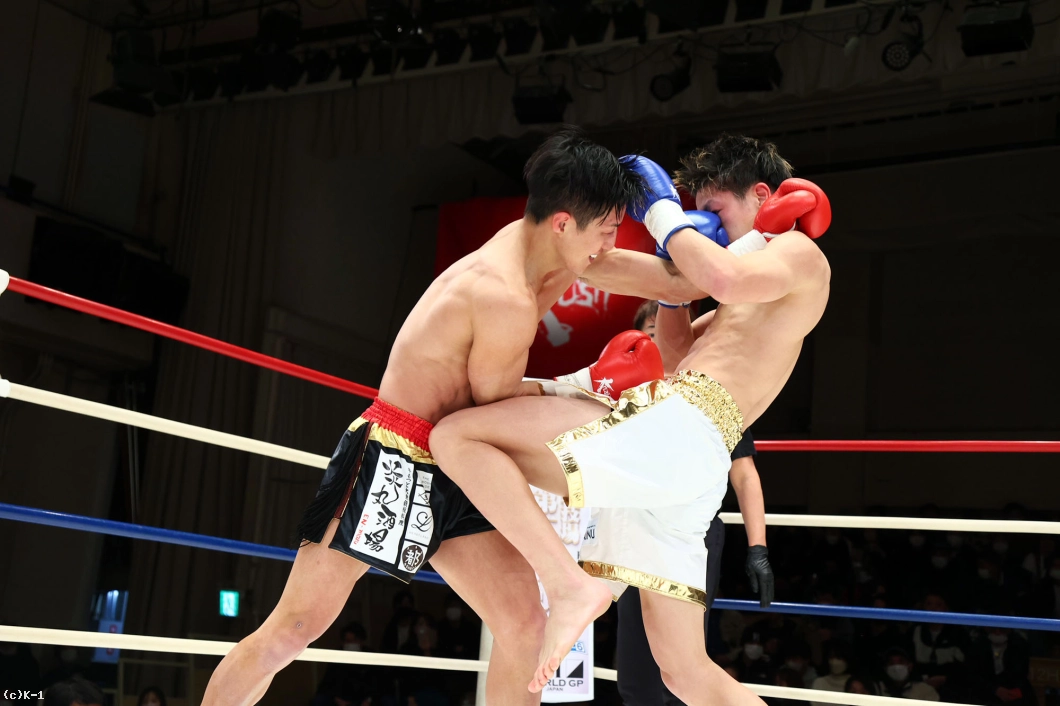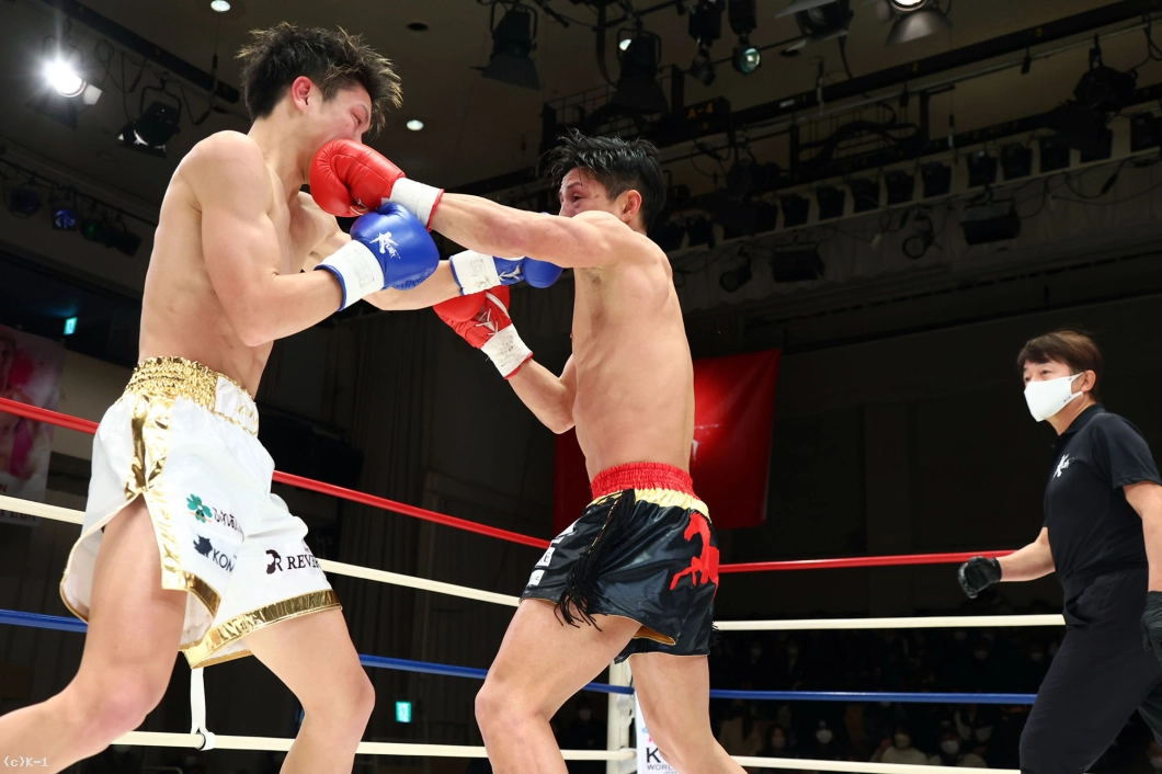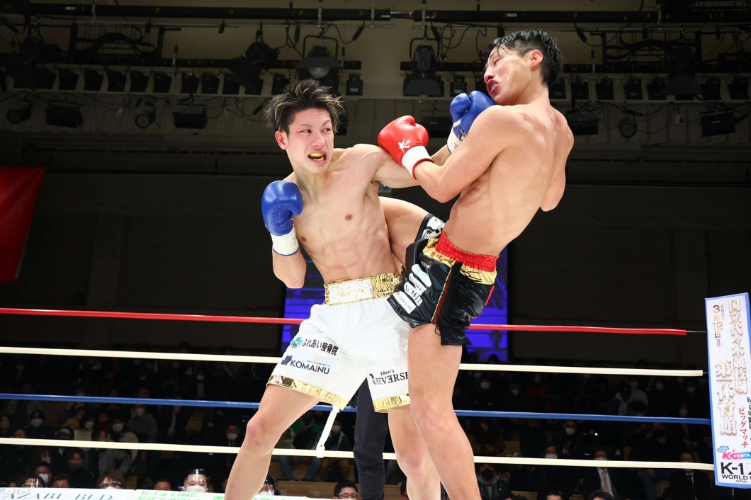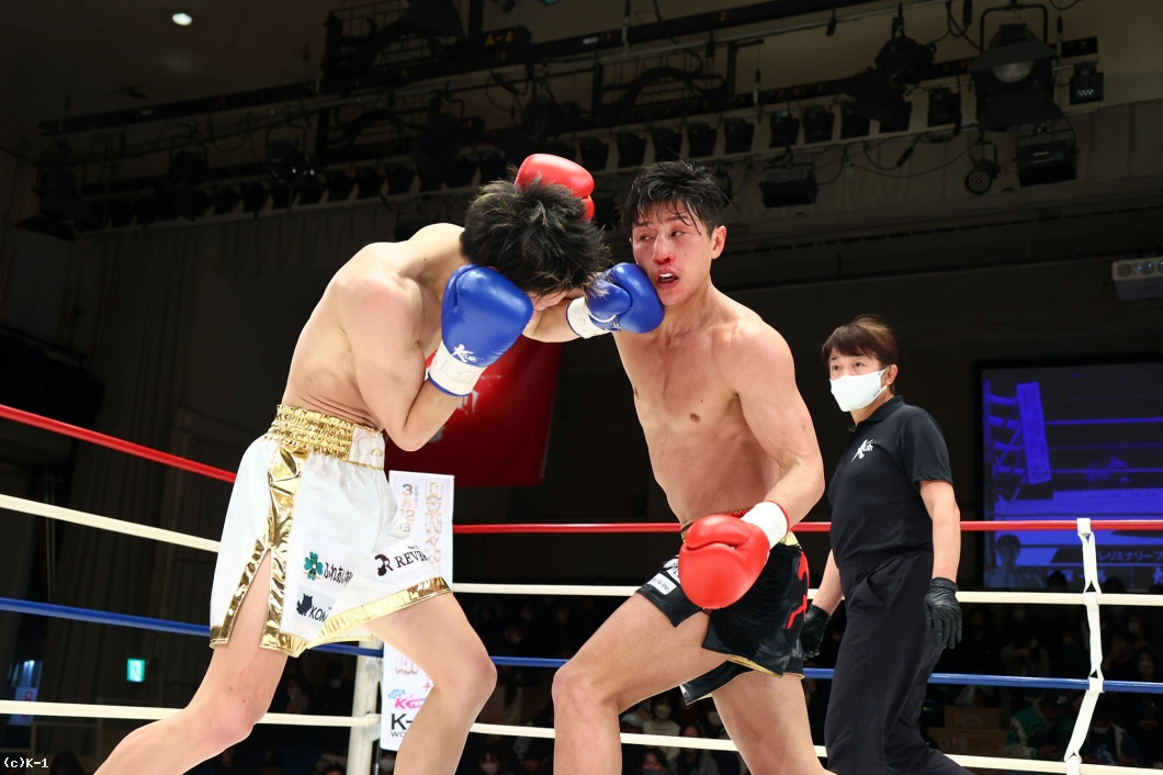 3R、久保は打点の高い前蹴りから入り、やはり攻勢を掛けていく。小松も押し返しアッパーを振るいヒザを放つが、久保が圧力でまさって小松にボディブロー、ストレート、フックと攻める。
