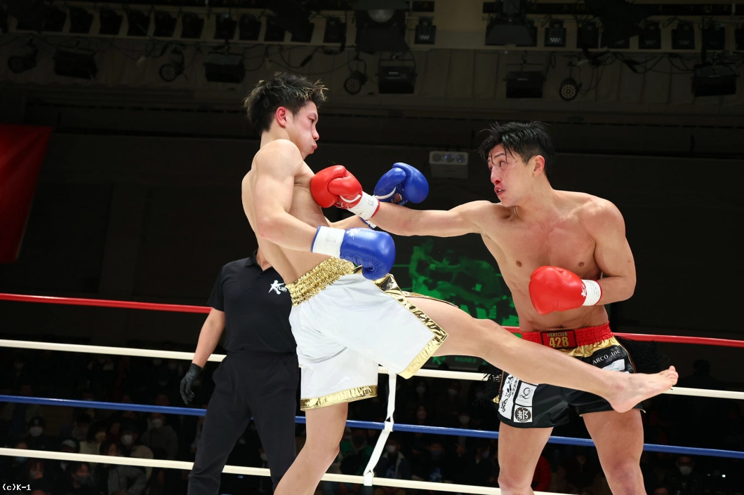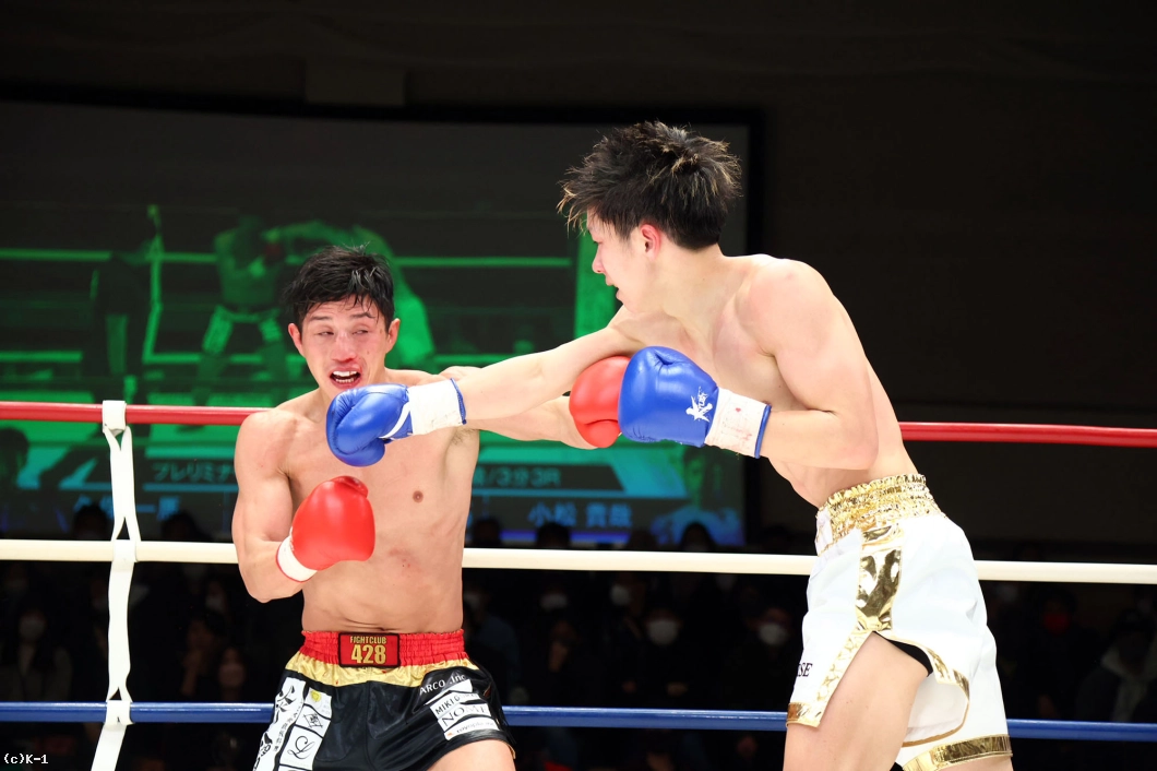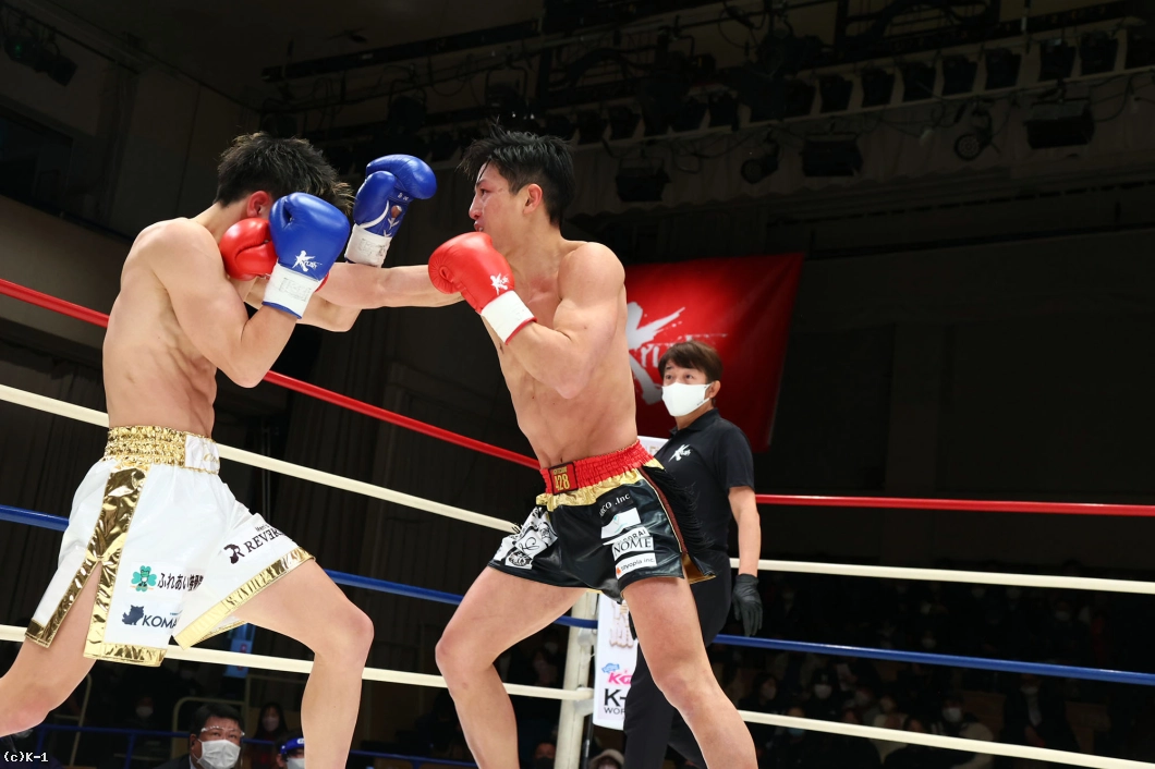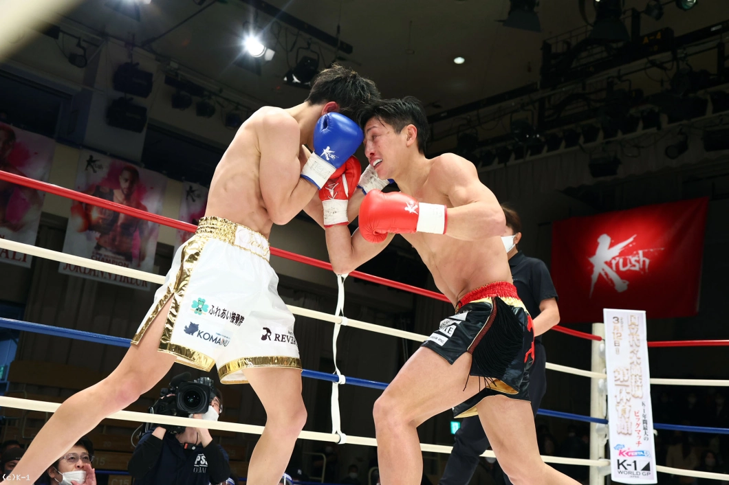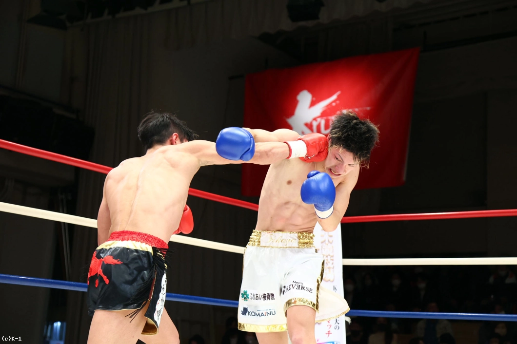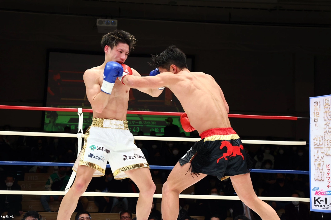 2Rも久保は前に出て行くが、小松はこのラウンドこれに負けず自身も前に出て右ストレートと左フックを振るう。両者一進一退。パンチ主体の久保に対し小松はパンチにヒザを織り交ぜる。久保はボディ打ちからパンチを顔に返す。馬力でやや上回り小松を下がらせていく。
